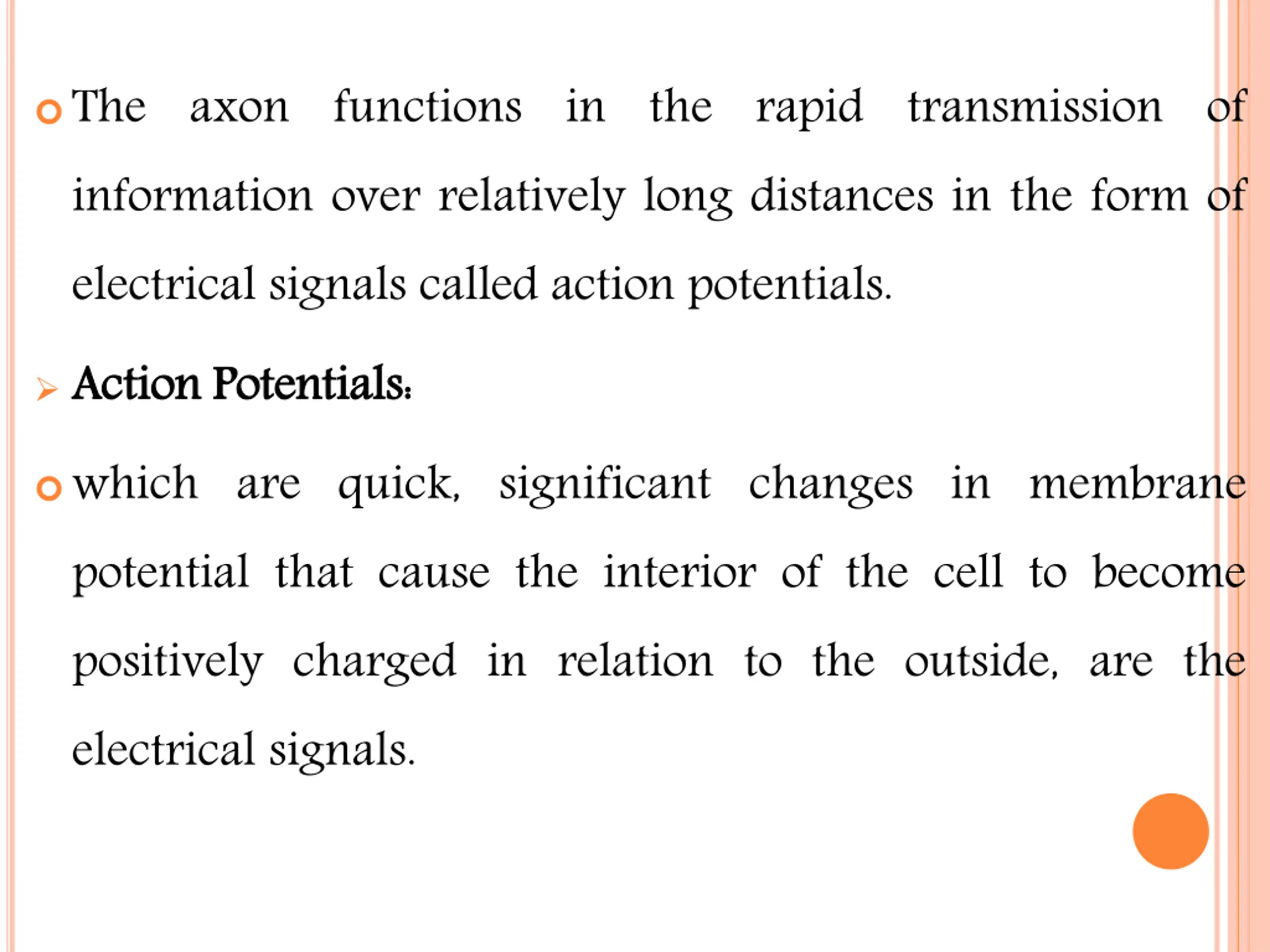 The axon functions in the rapid transmission of information over relatively long distances in the form of electrical signals called action potentials. Action Potentials Action Potentials: : which are quick, significant changes in membrane potential that cause the interior of the cell to become positively charged in relation to the outside, are the electrical signals.