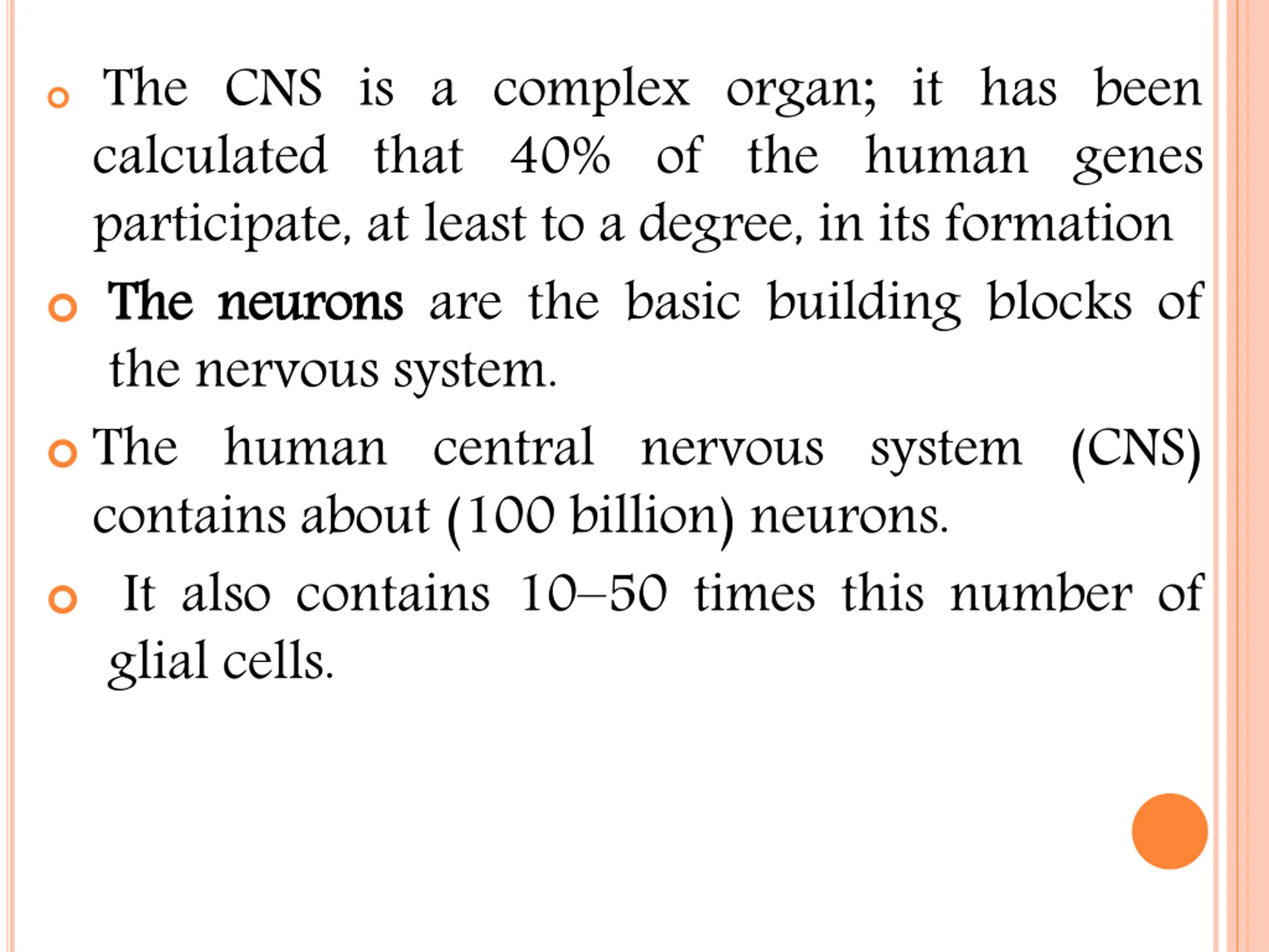 The CNS is a complex organ; it has been calculated that 40% of the human genes participate, at least to a degree, in its formation The the nervous system. The human central nervous system (CNS) contains about (100 billion) neurons. It also contains 10 50 times this number of glial cells. The neurons neurons are the basic building blocks of