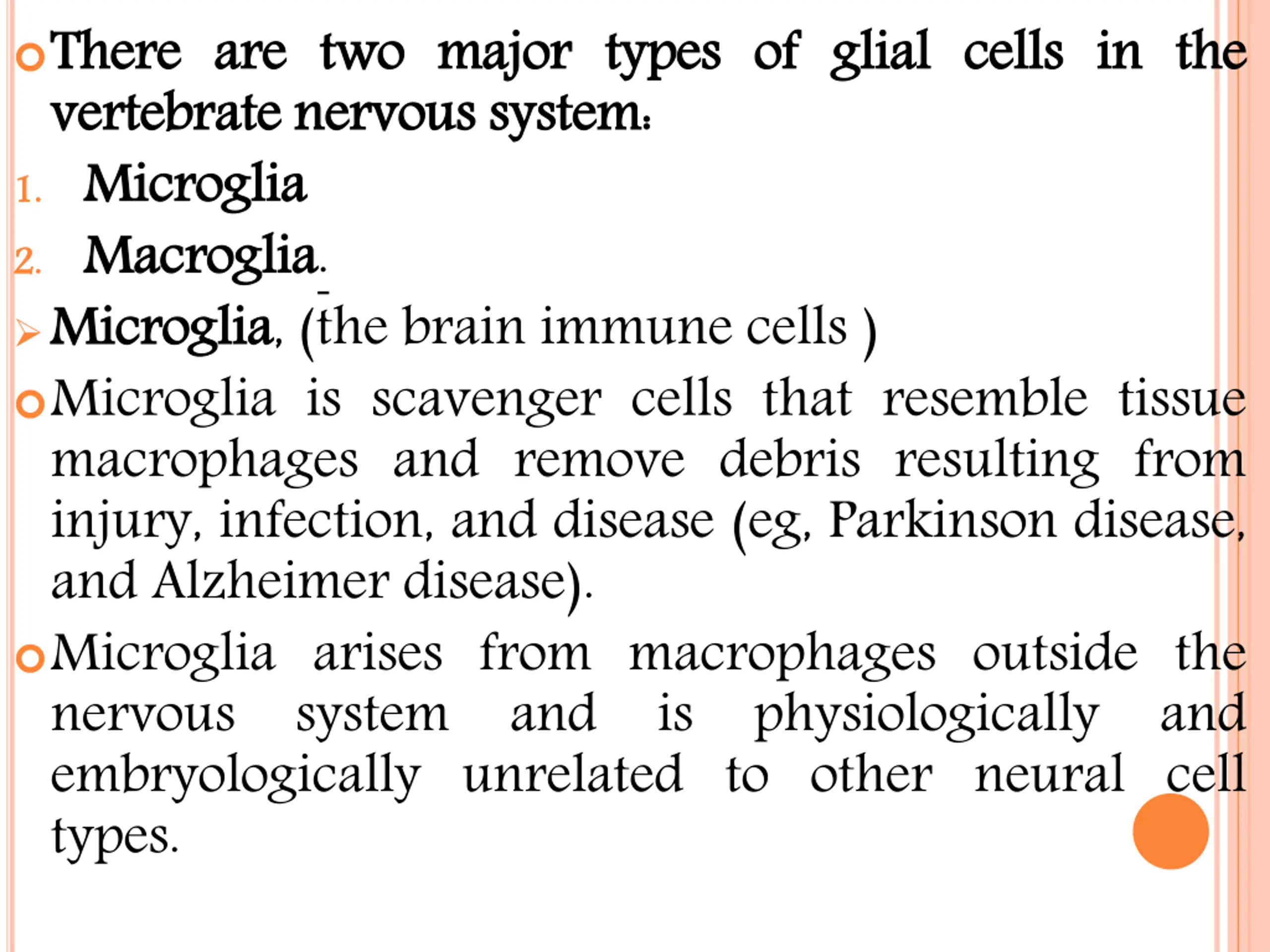 There vertebrate 1. 1. Microglia 2. 2. Macroglia Microglia Microglia is scavenger cells that resemble tissue macrophages and remove debris resulting from injury, infection, and disease (eg, Parkinson disease, and Alzheimer disease). Microglia arises from macrophages outside the nervous system and is physiologically and embryologically unrelated to other neural cell types. There are vertebrate nervous Microglia Macroglia. Microglia, (the brain immune cells ) are two nervous system two major major types system: : types of of glial glial cells cells in in the the