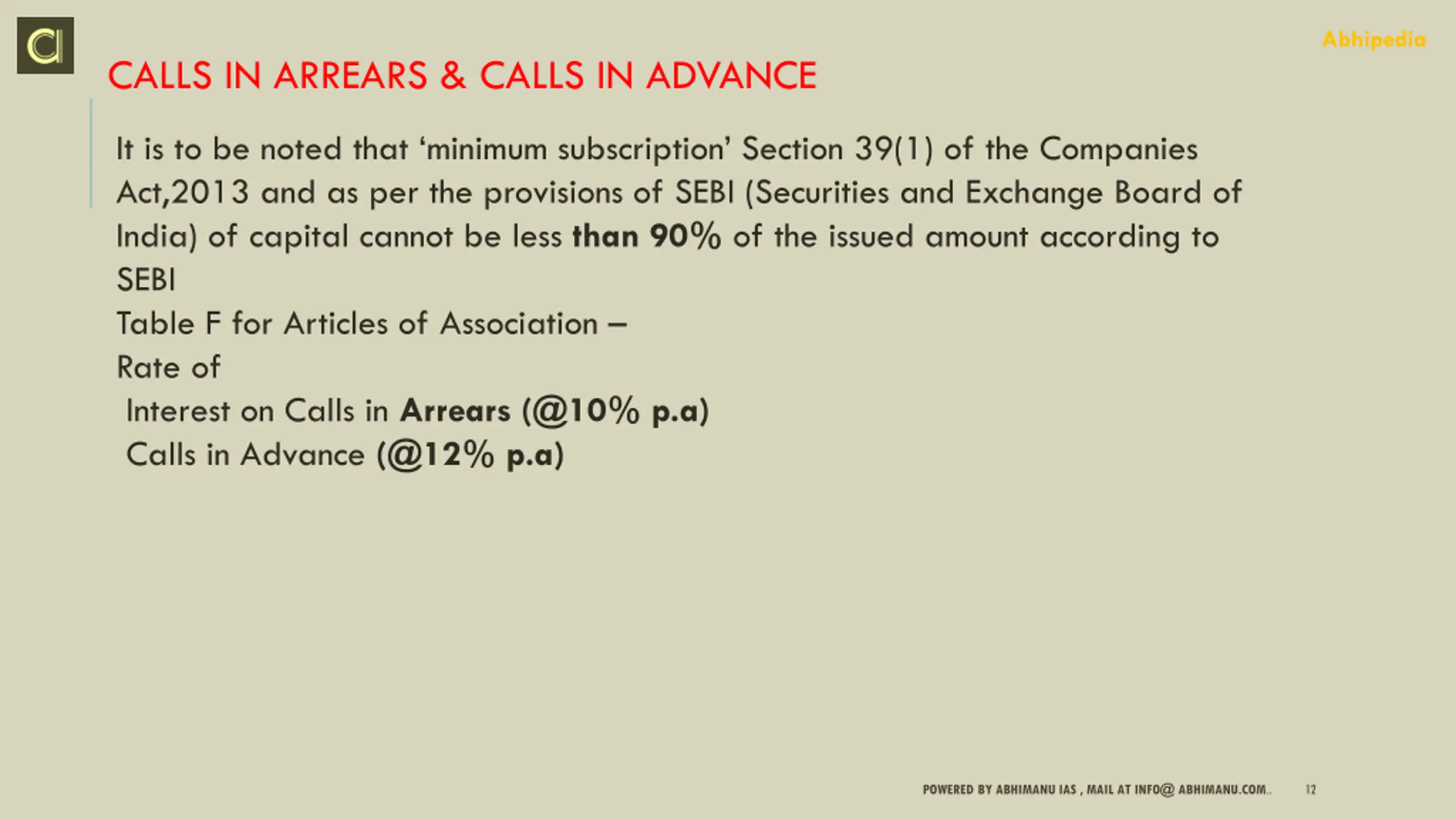 Abhipedia CALLS IN ARREARS & CALLS IN ADVANCE It is to be noted that minimum subscription Section 39(1) of the Companies Act,2013 and as per the provisions of SEBI (Securities and Exchange Board of India) of capital cannot be less than 90% of the issued amount according to SEBI Table F for Articles of Association Rate of Interest on Calls in Arrears (@10% p.a) Calls in Advance (@12% p.a) POWERED BY ABHIMANU IAS , MAIL AT INFO@ ABHIMANU.COM.. 12