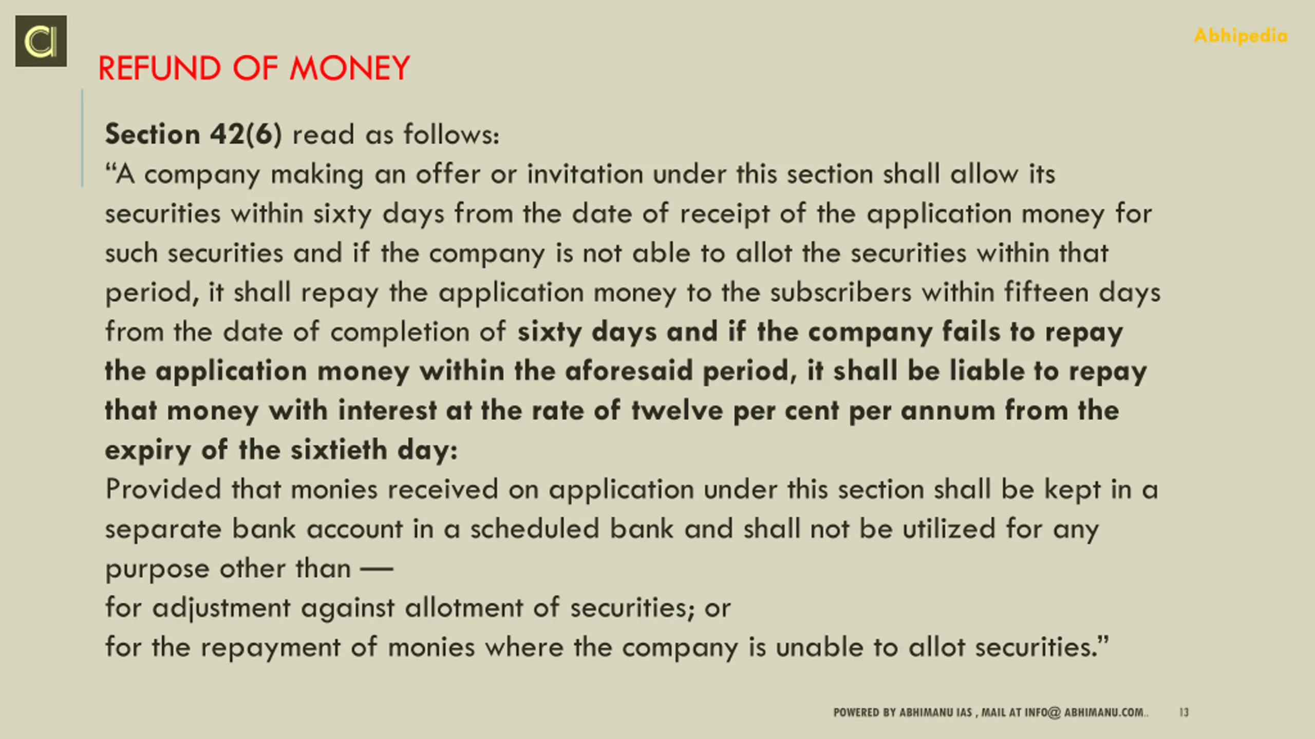 Abhipedia REFUND OF MONEY Section 42(6) read as follows: A company making an offer or invitation under this section shall allow its securities within sixty days from the date of receipt of the application money for such securities and if the company is not able to allot the securities within that period, it shall repay the application money to the subscribers within fifteen days from the date of completion of sixty days and if the company fails to repay the application money within the aforesaid period, it shall be liable to repay that money with interest at the rate of twelve per cent per annum from the expiry of the sixtieth day: Provided that monies received on application under this section shall be kept in a separate bank account in a scheduled bank and shall not be utilized for any purpose other than for adjustment against allotment of securities; or for the repayment of monies where the company is unable to allot securities. POWERED BY ABHIMANU IAS , MAIL AT INFO@ ABHIMANU.COM.. 13