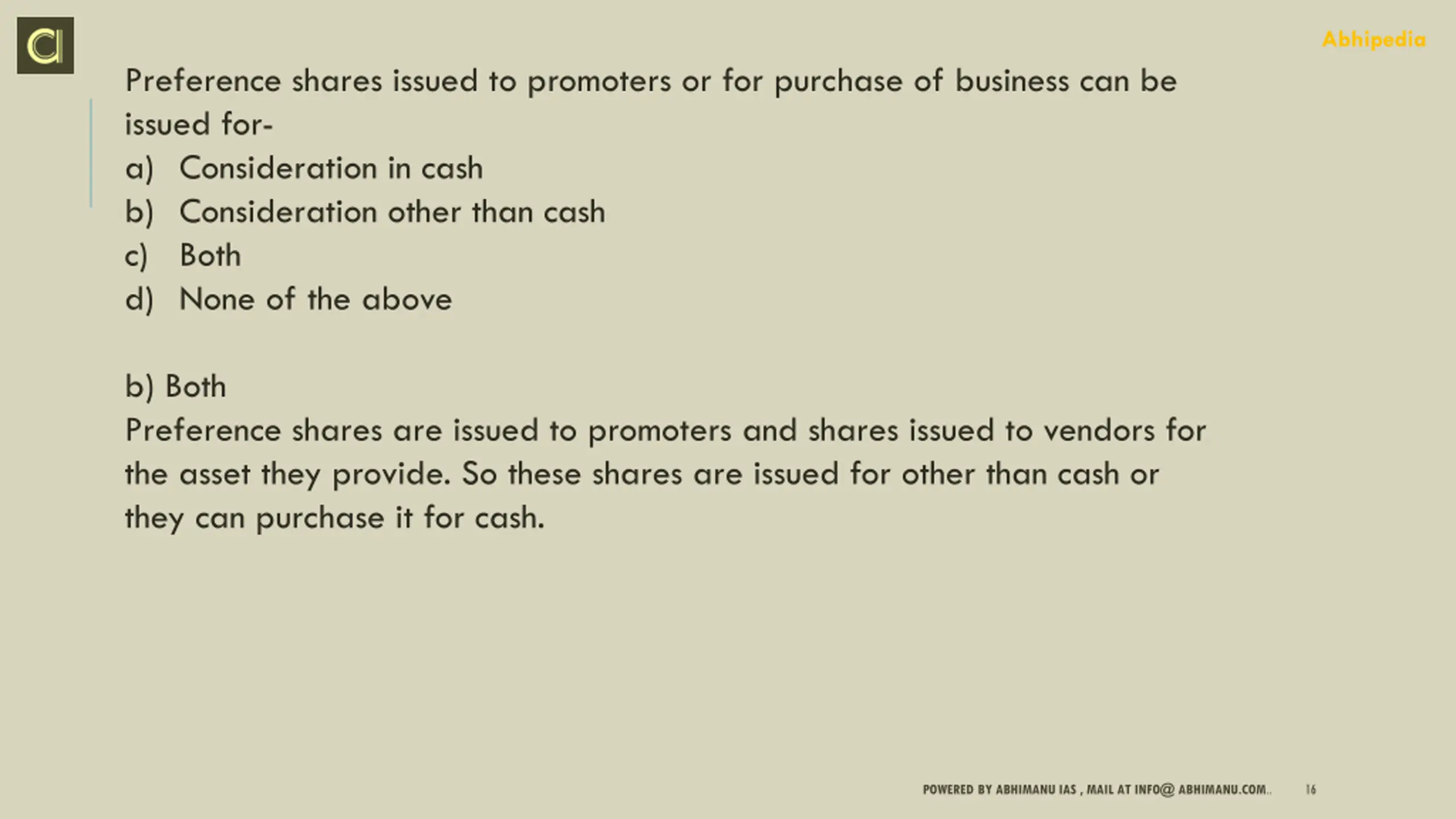 Abhipedia Preference shares issued to promoters or for purchase of business can be issued for- a) Consideration in cash b) Consideration other than cash c) Both d) None of the above b) Both Preference shares are issued to promoters and shares issued to vendors for the asset they provide. So these shares are issued for other than cash or they can purchase it for cash. POWERED BY ABHIMANU IAS , MAIL AT INFO@ ABHIMANU.COM.. 16