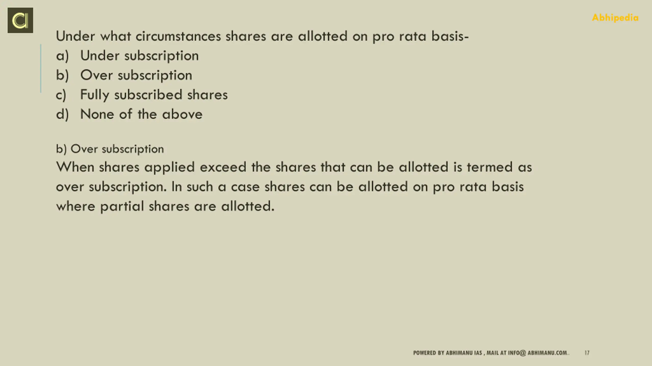 Abhipedia Under what circumstances shares are allotted on pro rata basis- a) Under subscription b) Over subscription c) Fully subscribed shares d) None of the above b) Over subscription When shares applied exceed the shares that can be allotted is termed as over subscription. In such a case shares can be allotted on pro rata basis where partial shares are allotted. POWERED BY ABHIMANU IAS , MAIL AT INFO@ ABHIMANU.COM.. 17