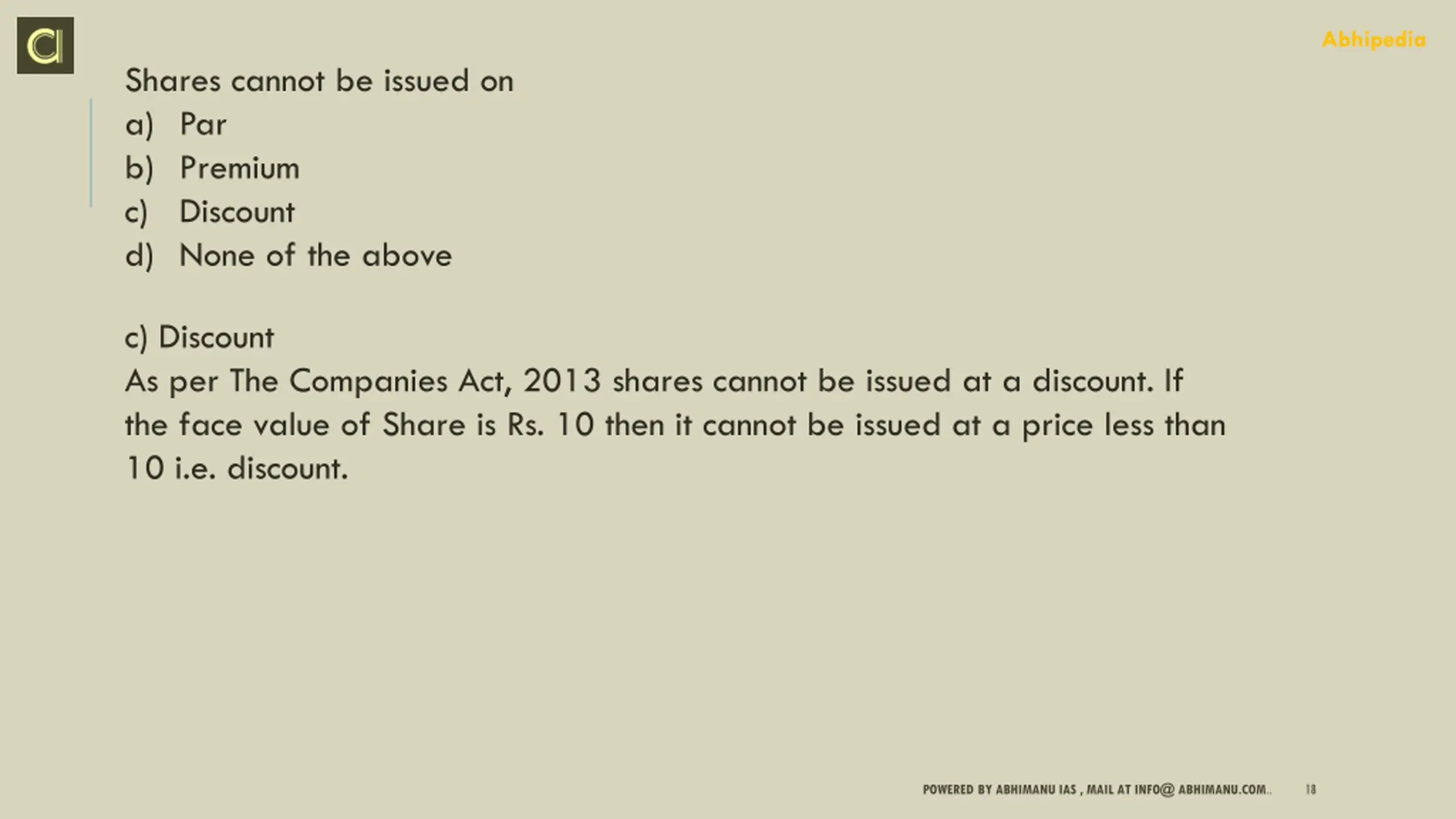 Abhipedia Shares cannot be issued on a) Par b) Premium c) Discount d) None of the above c) Discount As per The Companies Act, 2013 shares cannot be issued at a discount. If the face value of Share is Rs. 10 then it cannot be issued at a price less than 10 i.e. discount. POWERED BY ABHIMANU IAS , MAIL AT INFO@ ABHIMANU.COM.. 18