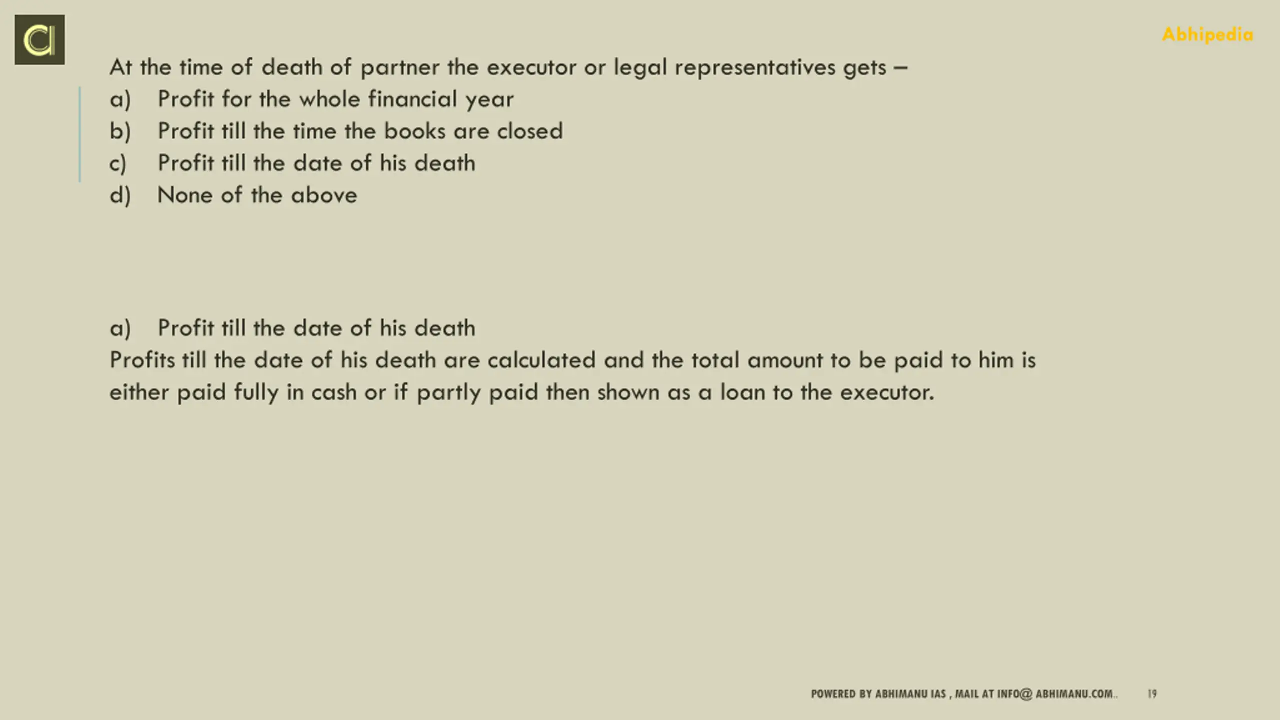 Abhipedia At the time of death of partner the executor or legal representatives gets a) Profit for the whole financial year b) Profit till the time the books are closed c) Profit till the date of his death d) None of the above a) Profits till the date of his death are calculated and the total amount to be paid to him is either paid fully in cash or if partly paid then shown as a loan to the executor. Profit till the date of his death POWERED BY ABHIMANU IAS , MAIL AT INFO@ ABHIMANU.COM.. 19