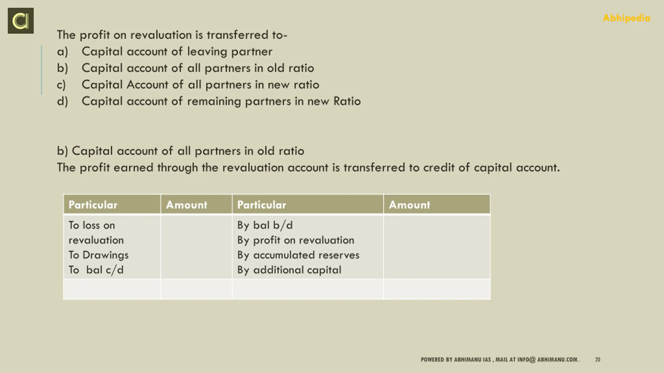 Abhipedia The profit on revaluation is transferred to- a) Capital account of leaving partner b) Capital account of all partners in old ratio c) Capital Account of all partners in new ratio d) Capital account of remaining partners in new Ratio b) Capital account of all partners in old ratio The profit earned through the revaluation account is transferred to credit of capital account. Particular Amount Particular Amount To loss on revaluation To Drawings To bal c/d By bal b/d By profit on revaluation By accumulated reserves By additional capital POWERED BY ABHIMANU IAS , MAIL AT INFO@ ABHIMANU.COM.. 20