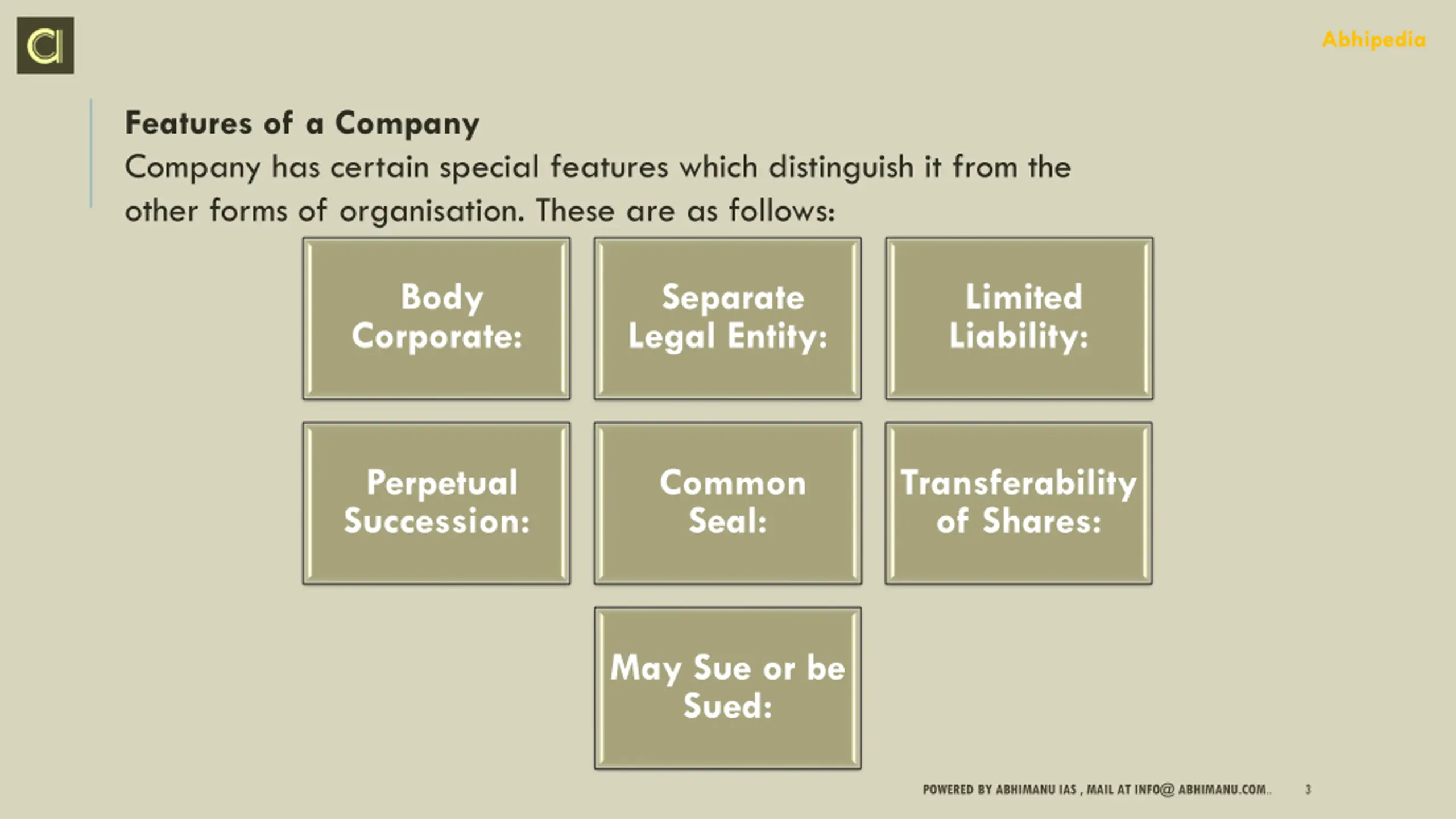 Abhipedia Features of a Company Company has certain special features which distinguish it from the other forms of organisation. These are as follows: Body Corporate: Separate Legal Entity: Limited Liability: Perpetual Succession: Common Seal: Transferability of Shares: May Sue or be Sued: POWERED BY ABHIMANU IAS , MAIL AT INFO@ ABHIMANU.COM.. 3