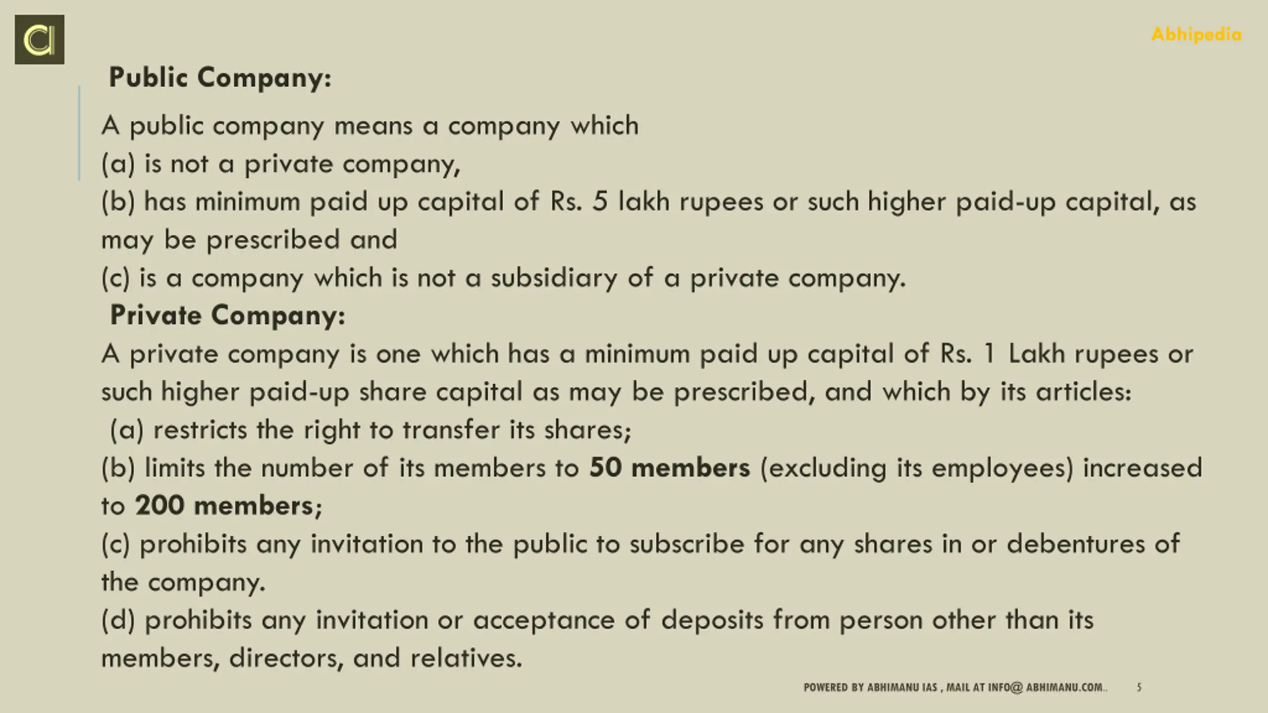 Abhipedia Public Company: A public company means a company which (a) is not a private company, (b) has minimum paid up capital of Rs. 5 lakh rupees or such higher paid-up capital, as may be prescribed and (c) is a company which is not a subsidiary of a private company. Private Company: A private company is one which has a minimum paid up capital of Rs. 1 Lakh rupees or such higher paid-up share capital as may be prescribed, and which by its articles: (a) restricts the right to transfer its shares; (b) limits the number of its members to 50 members (excluding its employees) increased to 200 members; (c) prohibits any invitation to the public to subscribe for any shares in or debentures of the company. (d) prohibits any invitation or acceptance of deposits from person other than its members, directors, and relatives. POWERED BY ABHIMANU IAS , MAIL AT INFO@ ABHIMANU.COM.. 5