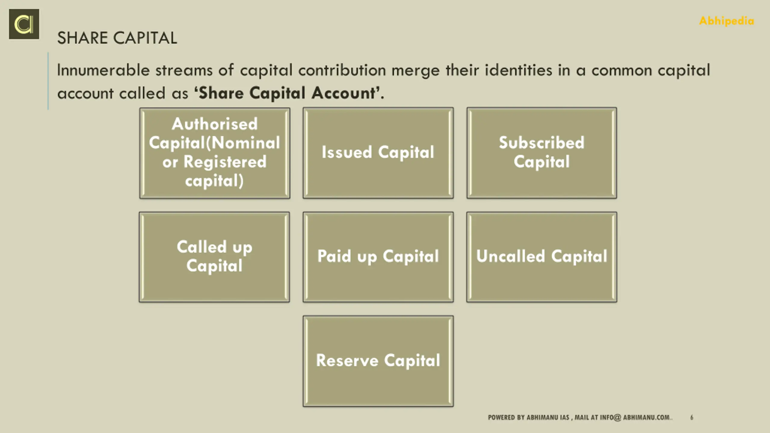 Abhipedia SHARE CAPITAL Innumerable streams of capital contribution merge their identities in a common capital account called as Share Capital Account . Authorised Capital(Nominal or Registered capital) Subscribed Capital Issued Capital Called up Capital Paid up Capital Uncalled Capital Reserve Capital POWERED BY ABHIMANU IAS , MAIL AT INFO@ ABHIMANU.COM.. 6
