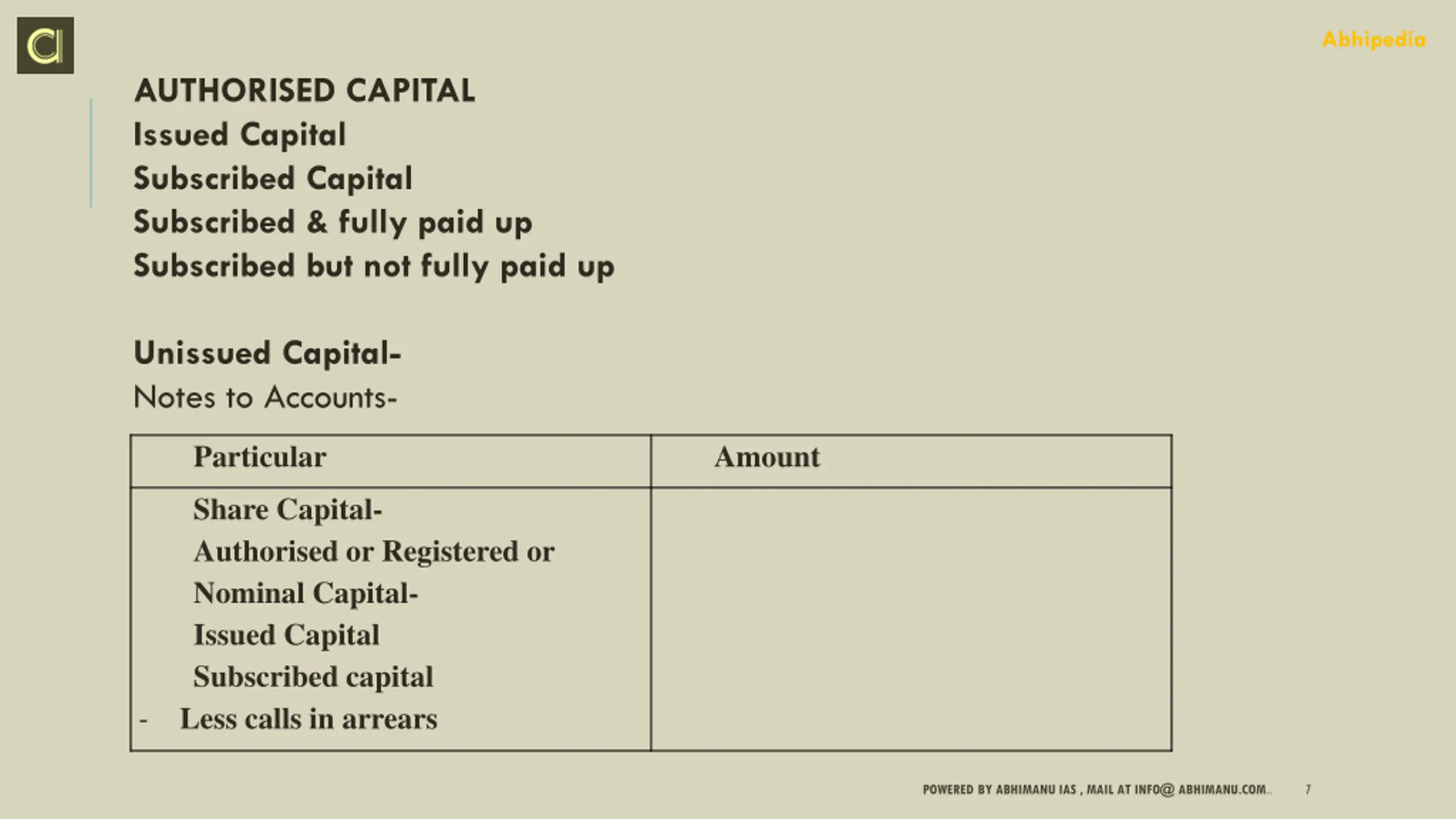 Abhipedia AUTHORISED CAPITAL Issued Capital Subscribed Capital Subscribed & fully paid up Subscribed but not fully paid up Unissued Capital- Notes to Accounts- Particular Amount Share Capital- Authorised or Registered or Nominal Capital- Issued Capital Subscribed capital Less calls in arrears - POWERED BY ABHIMANU IAS , MAIL AT INFO@ ABHIMANU.COM.. 7
