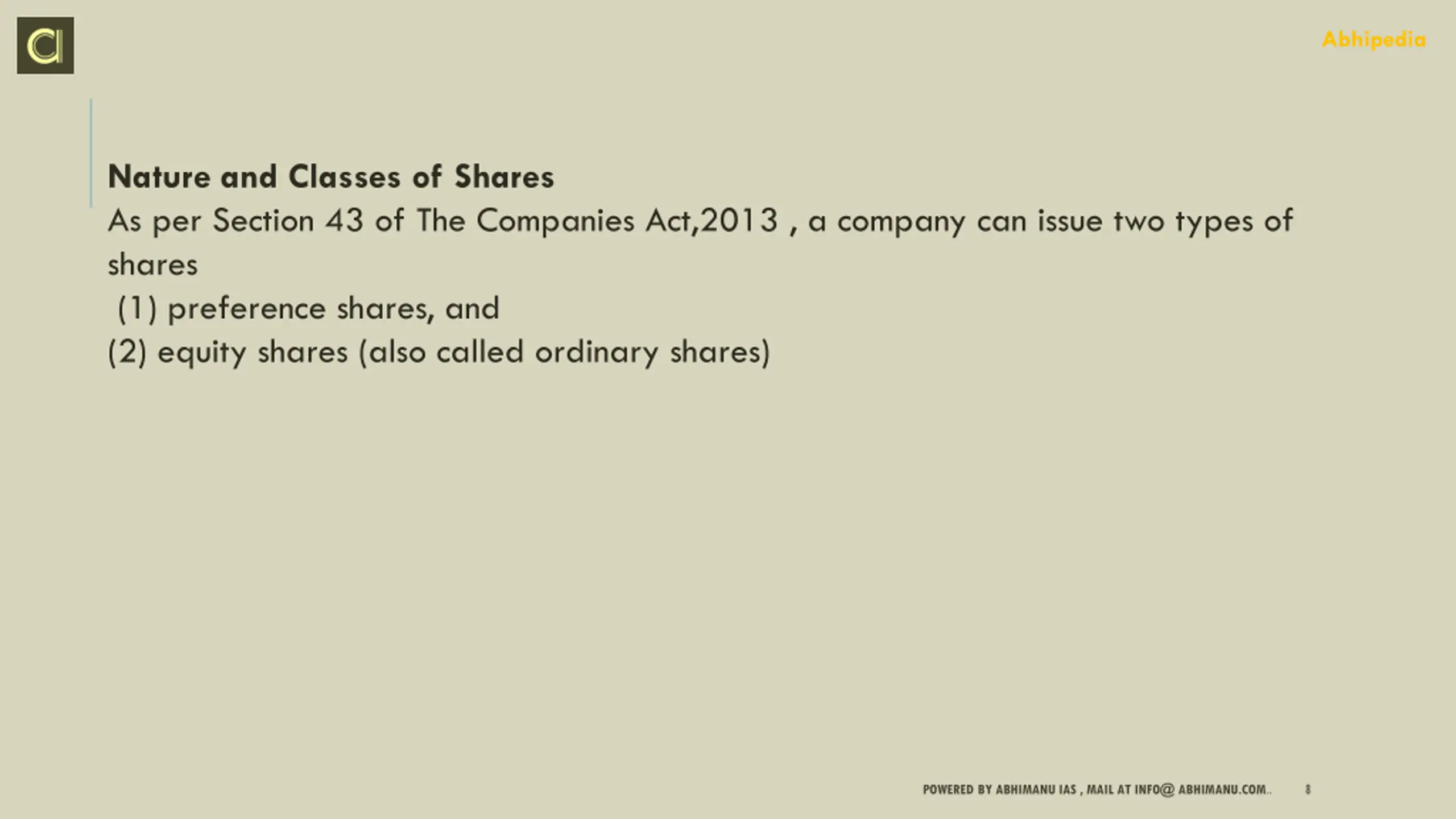 Abhipedia Nature and Classes of Shares As per Section 43 of The Companies Act,2013 , a company can issue two types of shares (1) preference shares, and (2) equity shares (also called ordinary shares) POWERED BY ABHIMANU IAS , MAIL AT INFO@ ABHIMANU.COM.. 8