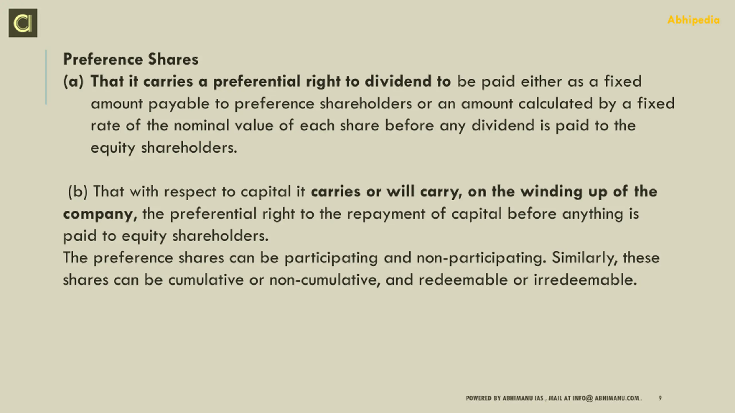 Abhipedia Preference Shares (a) That it carries a preferential right to dividend to be paid either as a fixed amount payable to preference shareholders or an amount calculated by a fixed rate of the nominal value of each share before any dividend is paid to the equity shareholders. (b) That with respect to capital it carries or will carry, on the winding up of the company, the preferential right to the repayment of capital before anything is paid to equity shareholders. The preference shares can be participating and non-participating. Similarly, these shares can be cumulative or non-cumulative, and redeemable or irredeemable. POWERED BY ABHIMANU IAS , MAIL AT INFO@ ABHIMANU.COM.. 9