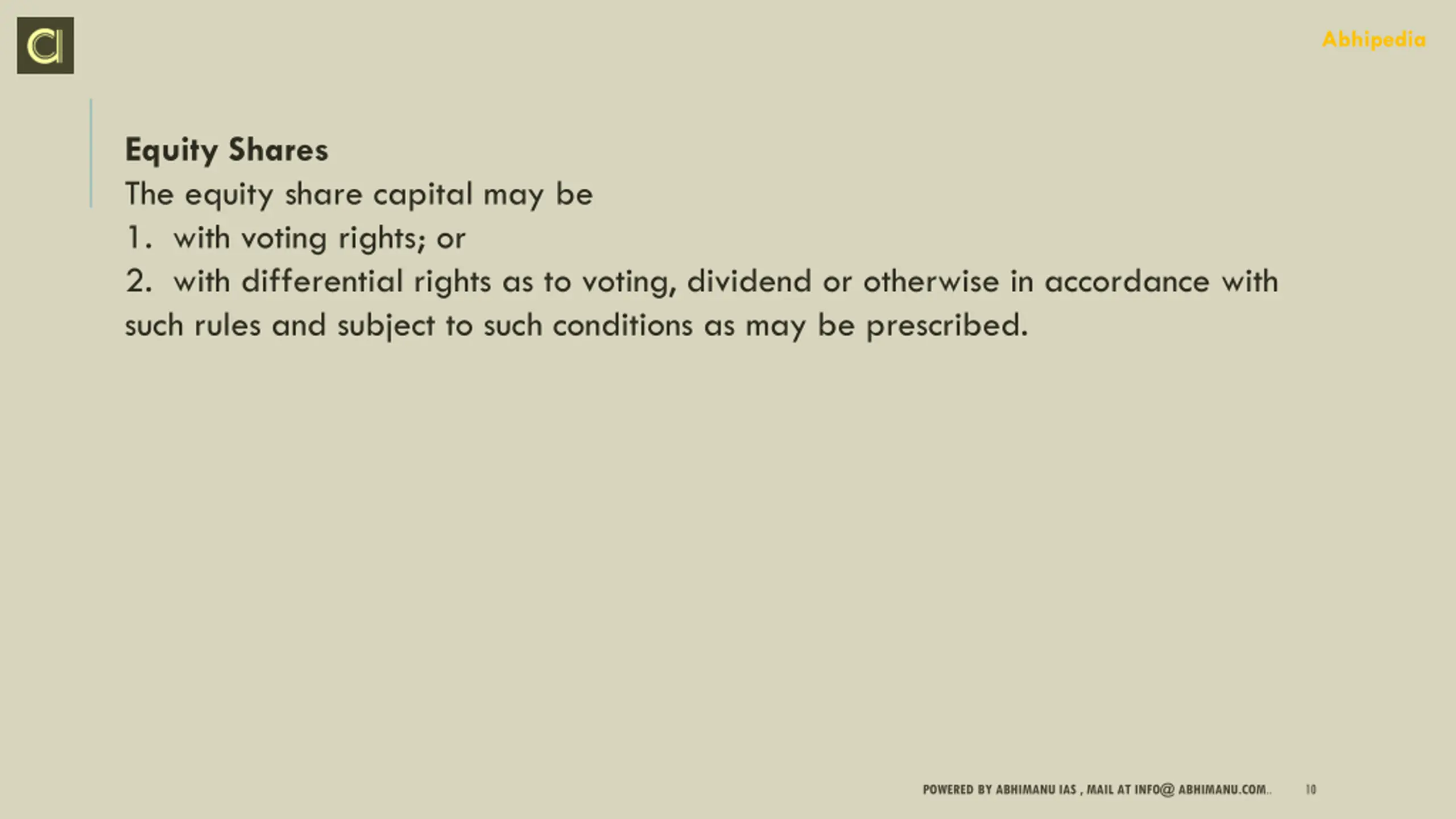 Abhipedia Equity Shares The equity share capital may be 1. with voting rights; or 2. with differential rights as to voting, dividend or otherwise in accordance with such rules and subject to such conditions as may be prescribed. POWERED BY ABHIMANU IAS , MAIL AT INFO@ ABHIMANU.COM.. 10