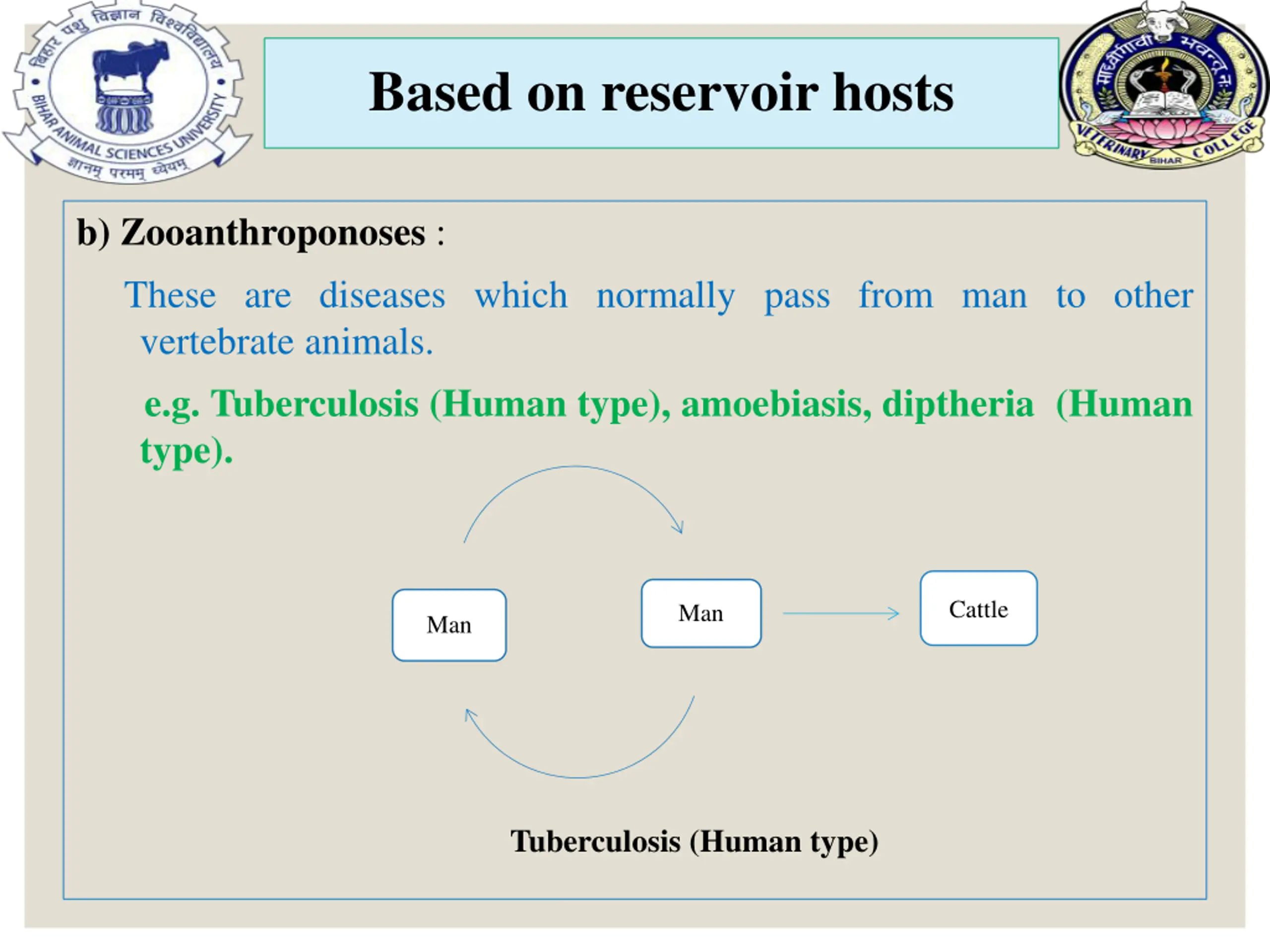 Based on reservoir hosts b) Zooanthroponoses : These are diseases which normally pass from man to other vertebrate animals. e.g. Tuberculosis (Human type), amoebiasis, diptheria (Human type). Cattle Man Man Tuberculosis (Human type)