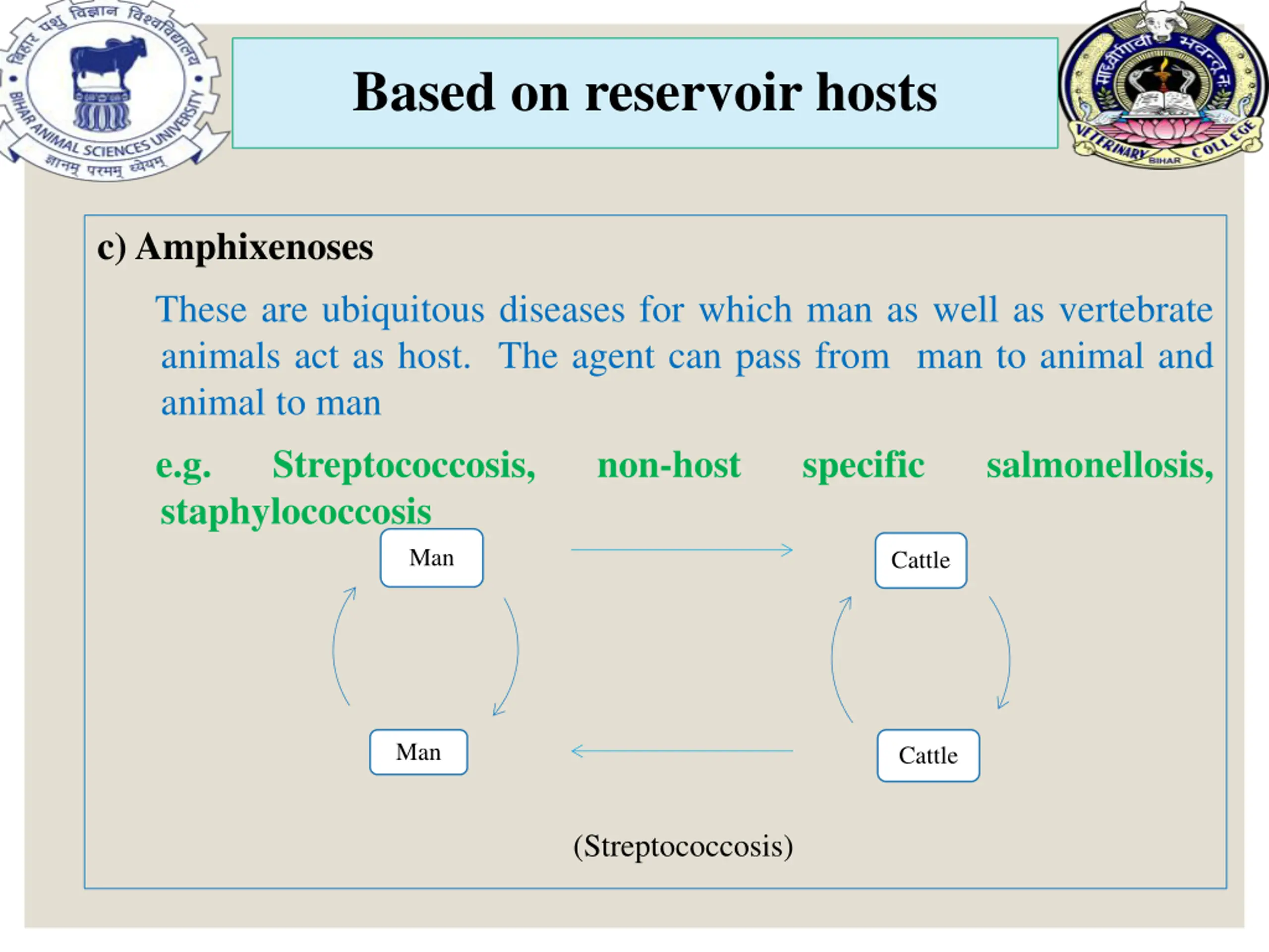 Based on reservoir hosts c) Amphixenoses These are ubiquitous diseases for which man as well as vertebrate animals act as host. The agent can pass from man to animal and animal to man e.g. Streptococcosis, non-host staphylococcosis specific salmonellosis, Man Cattle Man Cattle (Streptococcosis)