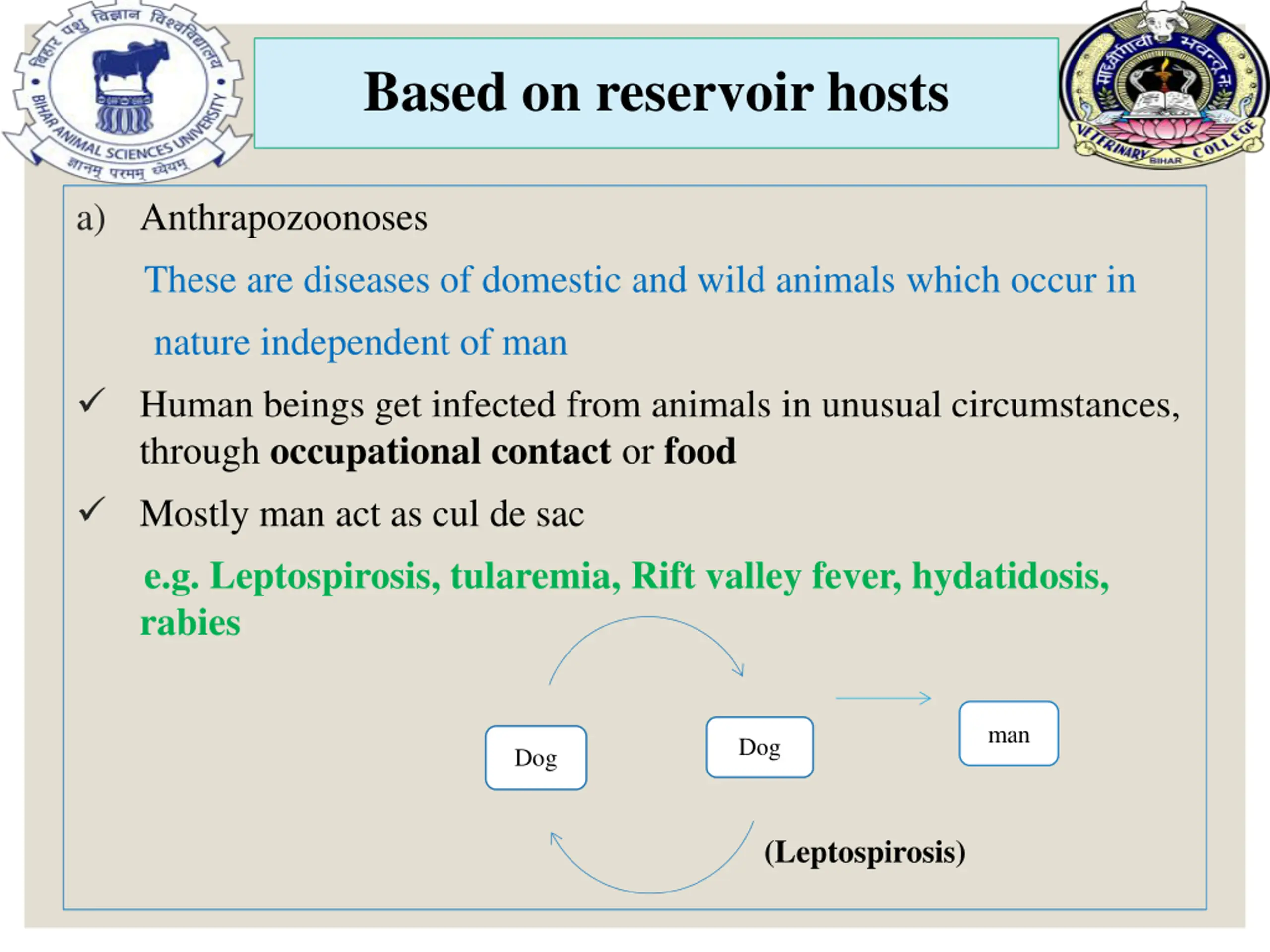 Based on reservoir hosts a) Anthrapozoonoses These are diseases of domestic and wild animals which occur in nature independent of man Human beings get infected from animals in unusual circumstances, through occupational contact or food Mostly man act as cul de sac e.g. Leptospirosis, tularemia, Rift valley fever, hydatidosis, rabies man Dog Dog (Leptospirosis)