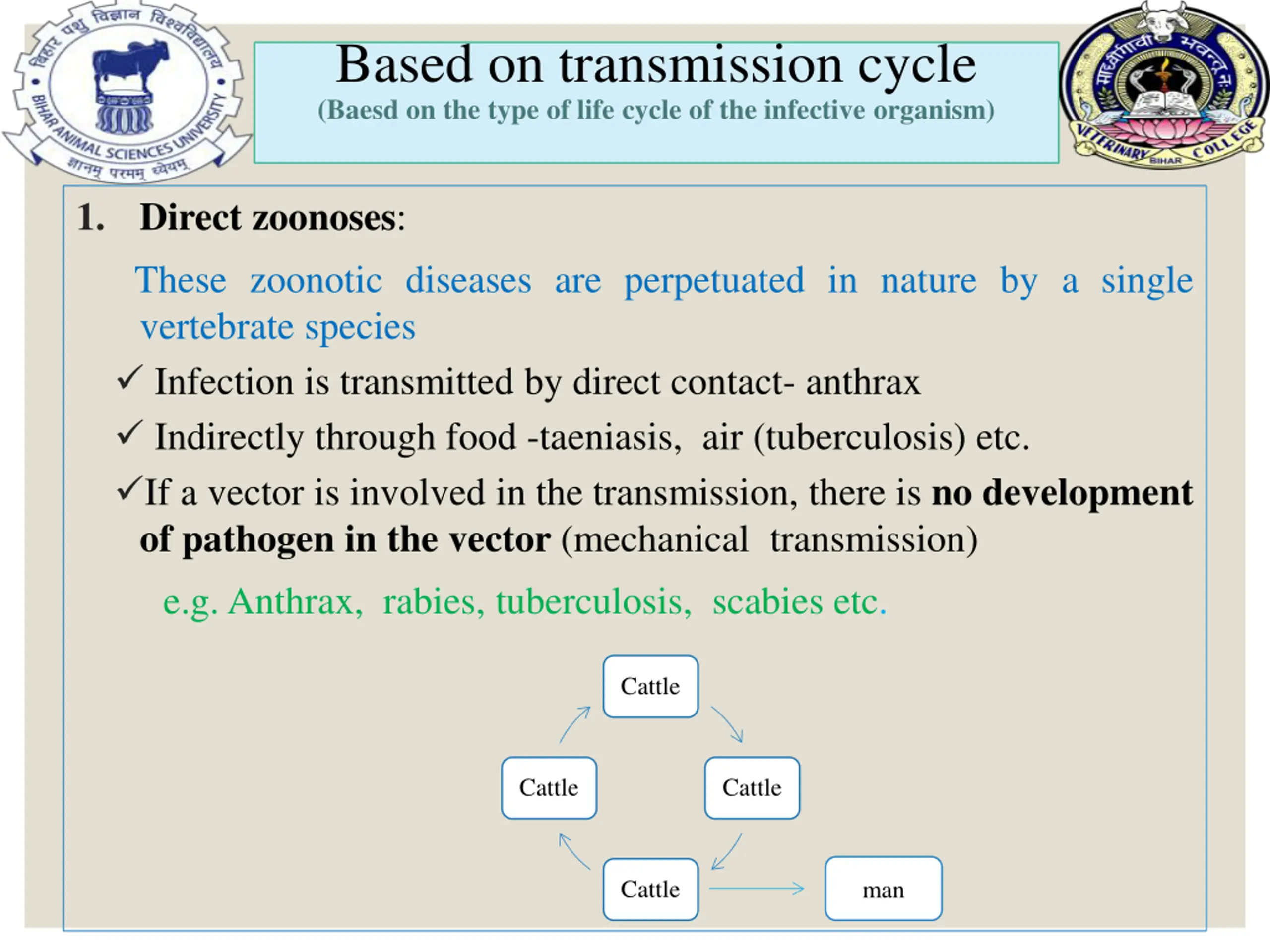 Based on transmission cycle (Baesd on the type of life cycle of the infective organism) 1. Direct zoonoses: These zoonotic diseases are perpetuated in nature by a single vertebrate species Infection is transmitted by direct contact- anthrax Indirectly through food -taeniasis, air (tuberculosis) etc. If a vector is involved in the transmission, there is no development of pathogen in the vector (mechanical transmission) e.g.Anthrax, rabies, tuberculosis, scabies etc. Cattle Cattle Cattle Cattle man