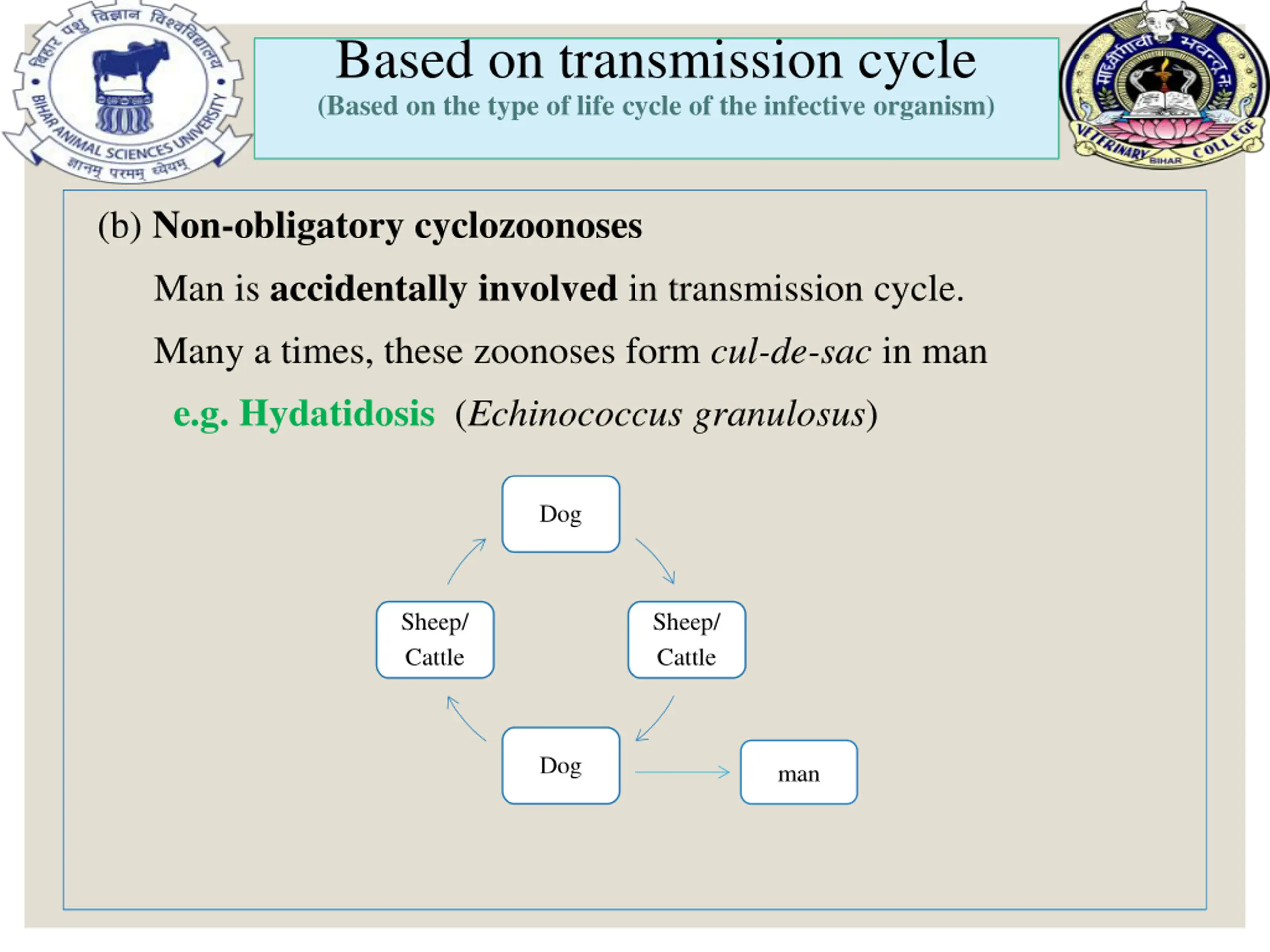 Based on transmission cycle (Based on the type of life cycle of the infective organism) (b) Non-obligatory cyclozoonoses Man is accidentally involved in transmission cycle. Many a times, these zoonoses form cul-de-sac in man e.g. Hydatidosis (Echinococcus granulosus) Dog Sheep/ Cattle Sheep/ Cattle Dog man