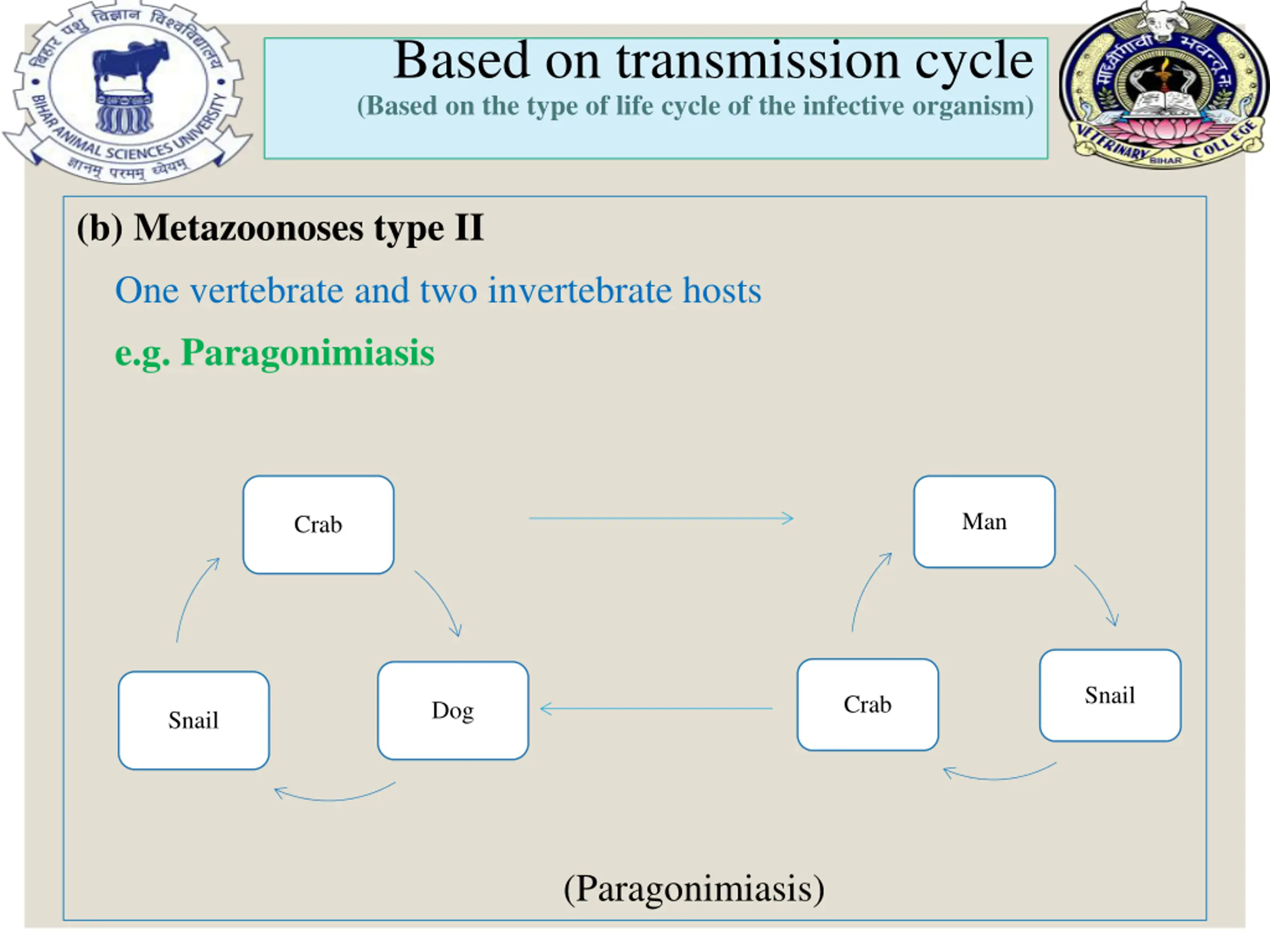 Based on transmission cycle (Based on the type of life cycle of the infective organism) (b) Metazoonoses type II One vertebrate and two invertebrate hosts e.g. Paragonimiasis Man Crab Snail Crab Dog Snail (Paragonimiasis)