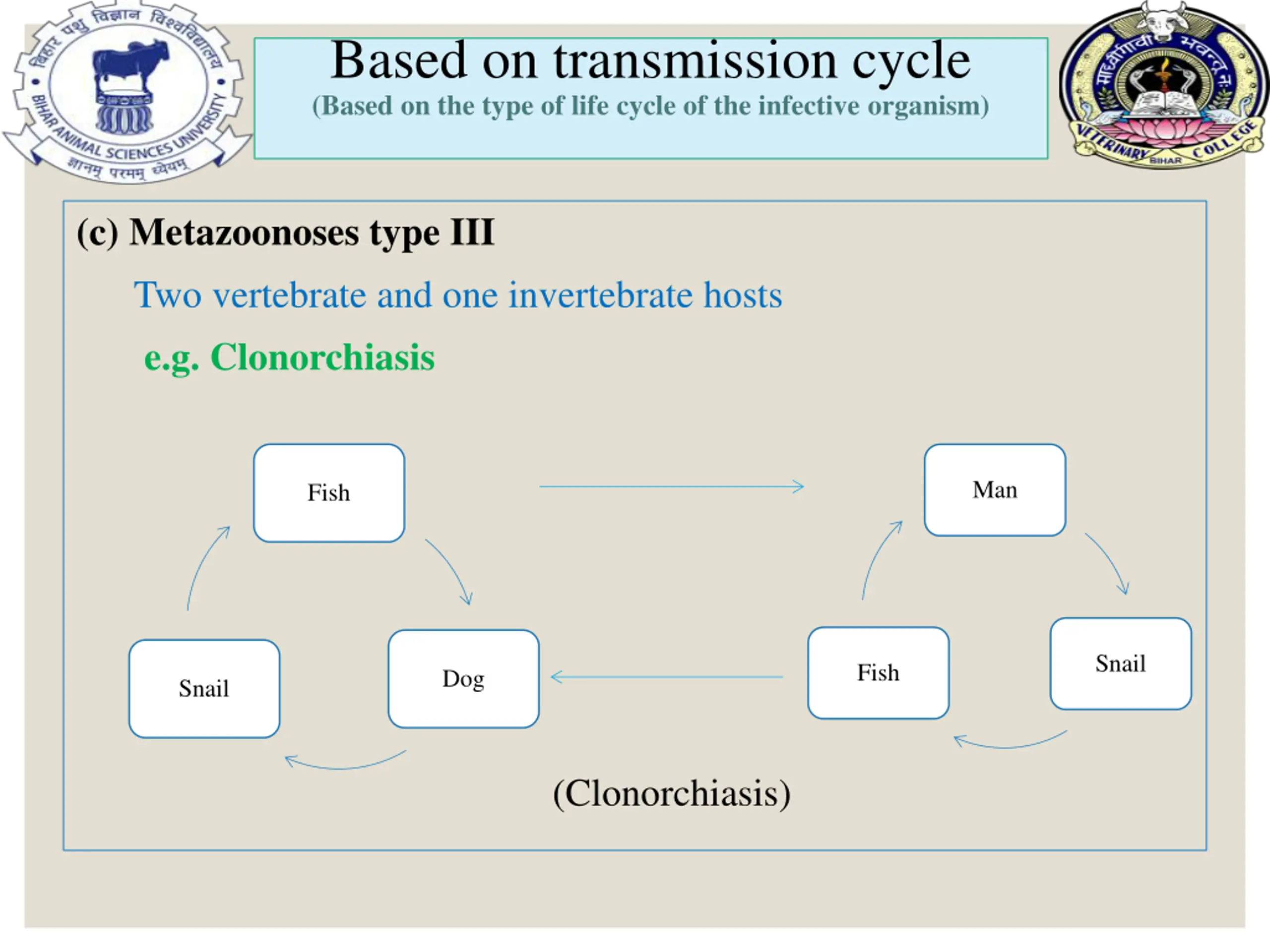 Based on transmission cycle (Based on the type of life cycle of the infective organism) (c) Metazoonoses type III Two vertebrate and one invertebrate hosts e.g. Clonorchiasis Man Fish Snail Fish Dog Snail (Clonorchiasis)