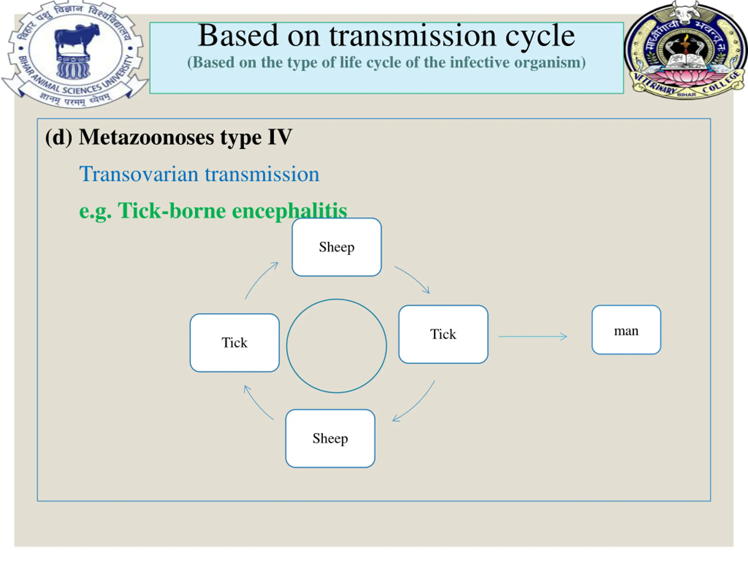 Based on transmission cycle (Based on the type of life cycle of the infective organism) (d) Metazoonoses type IV Transovarian transmission e.g. Tick-borne encephalitis Sheep man Tick Tick Sheep