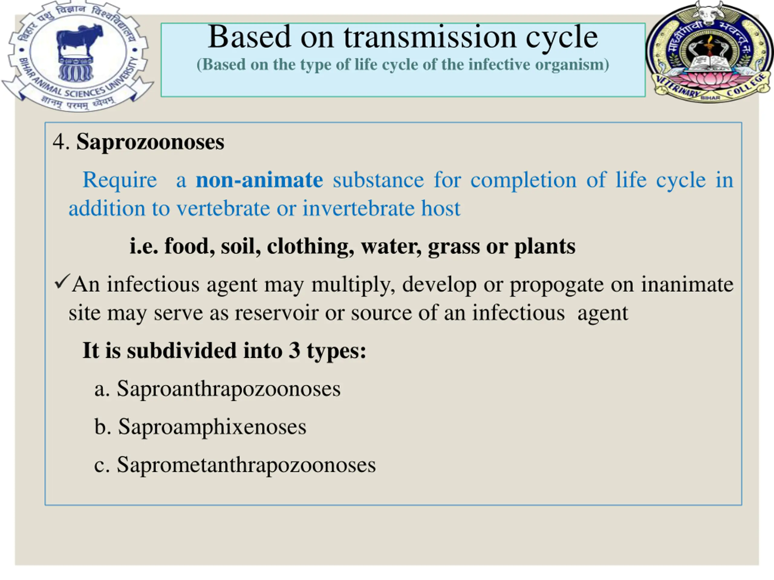 Based on transmission cycle (Based on the type of life cycle of the infective organism) 4. Saprozoonoses Require a non-animate substance for completion of life cycle in addition to vertebrate or invertebrate host i.e. food, soil, clothing, water, grass or plants An infectious agent may multiply, develop or propogate on inanimate site may serve as reservoir or source of an infectious agent It is subdivided into 3 types: a. Saproanthrapozoonoses b. Saproamphixenoses c. Saprometanthrapozoonoses