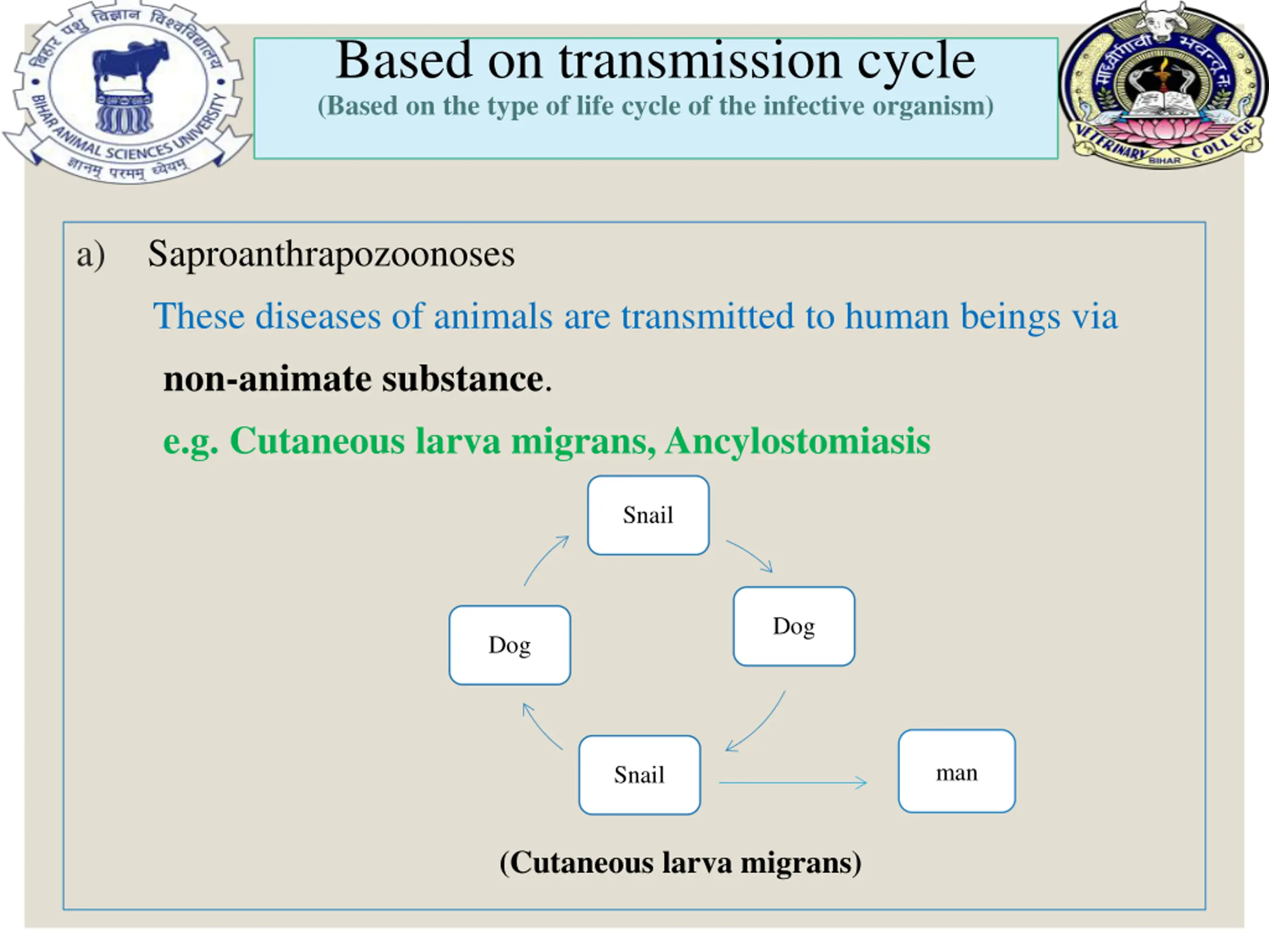 Based on transmission cycle (Based on the type of life cycle of the infective organism) a) These diseases of animals are transmitted to human beings via non-animate substance. e.g. Cutaneous larva migrans, Ancylostomiasis Saproanthrapozoonoses Snail Dog Dog man Snail (Cutaneous larva migrans)