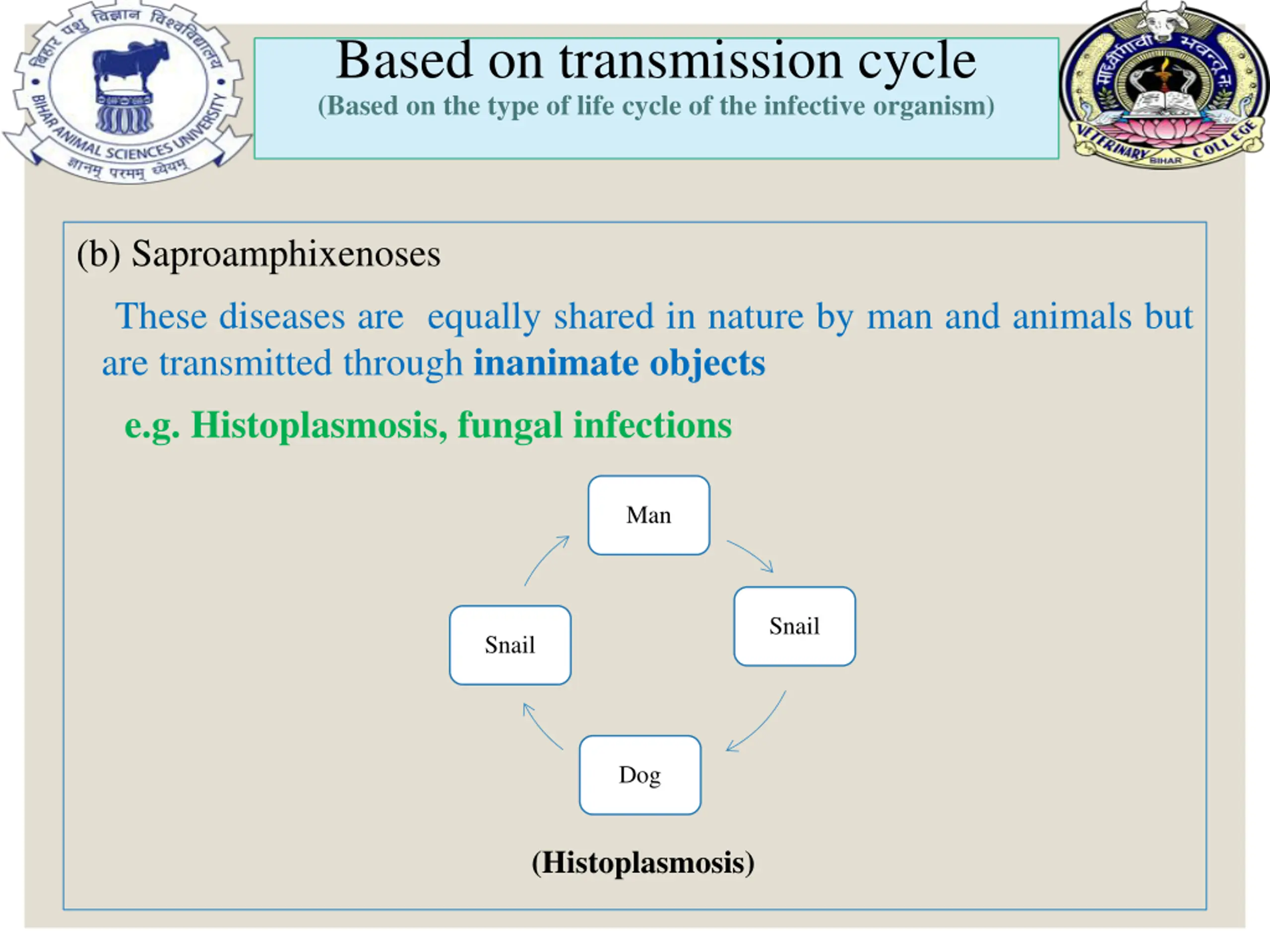 Based on transmission cycle (Based on the type of life cycle of the infective organism) (b) Saproamphixenoses These diseases are equally shared in nature by man and animals but are transmitted through inanimate objects e.g. Histoplasmosis, fungal infections Man Snail Snail Dog (Histoplasmosis)