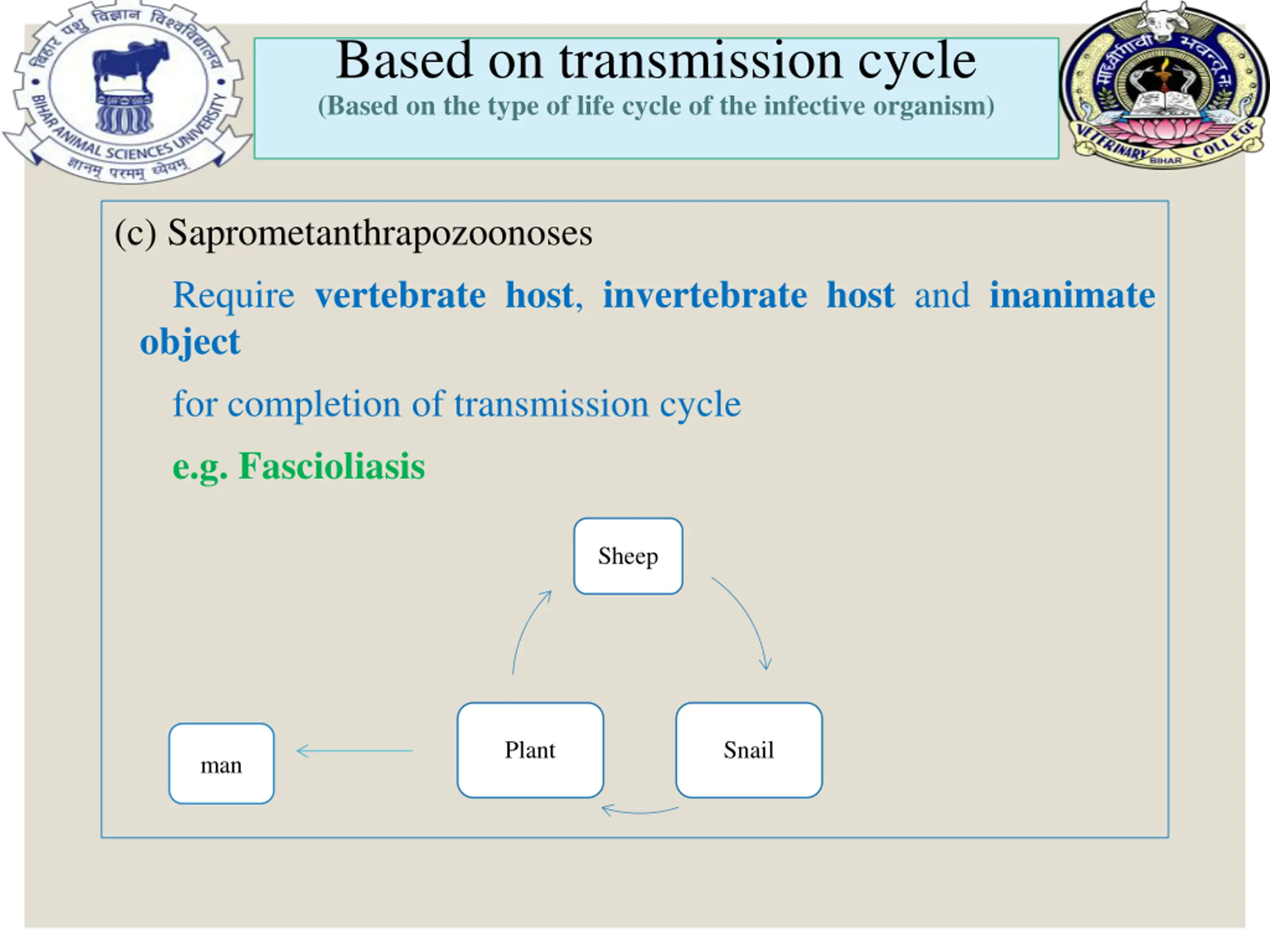 Based on transmission cycle (Based on the type of life cycle of the infective organism) (c) Saprometanthrapozoonoses Require vertebrate host, invertebrate host and inanimate object for completion of transmission cycle e.g. Fascioliasis Sheep Plant Snail man