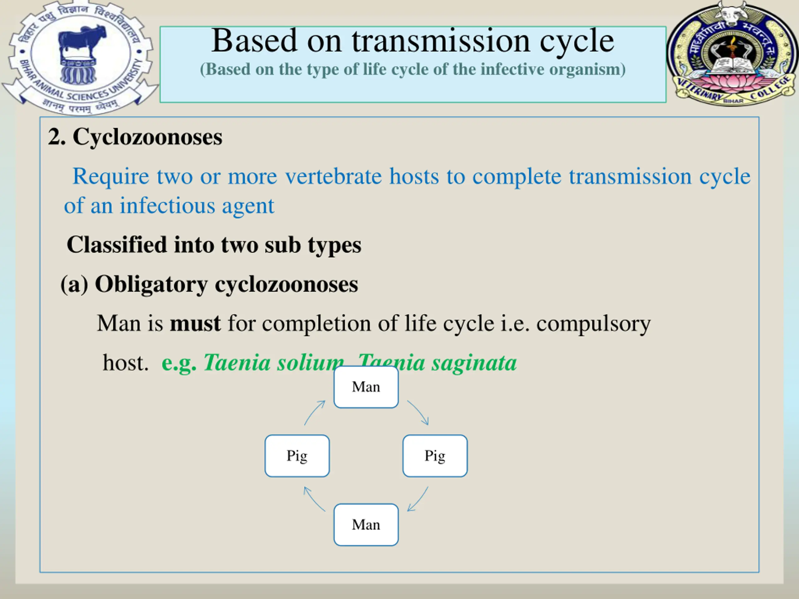 Based on transmission cycle (Based on the type of life cycle of the infective organism) 2. Cyclozoonoses Require two or more vertebrate hosts to complete transmission cycle of an infectious agent Classified into two sub types (a) Obligatory cyclozoonoses Man is must for completion of life cycle i.e. compulsory host. e.g. Taenia solium, Taenia saginata Man Pig Pig Man