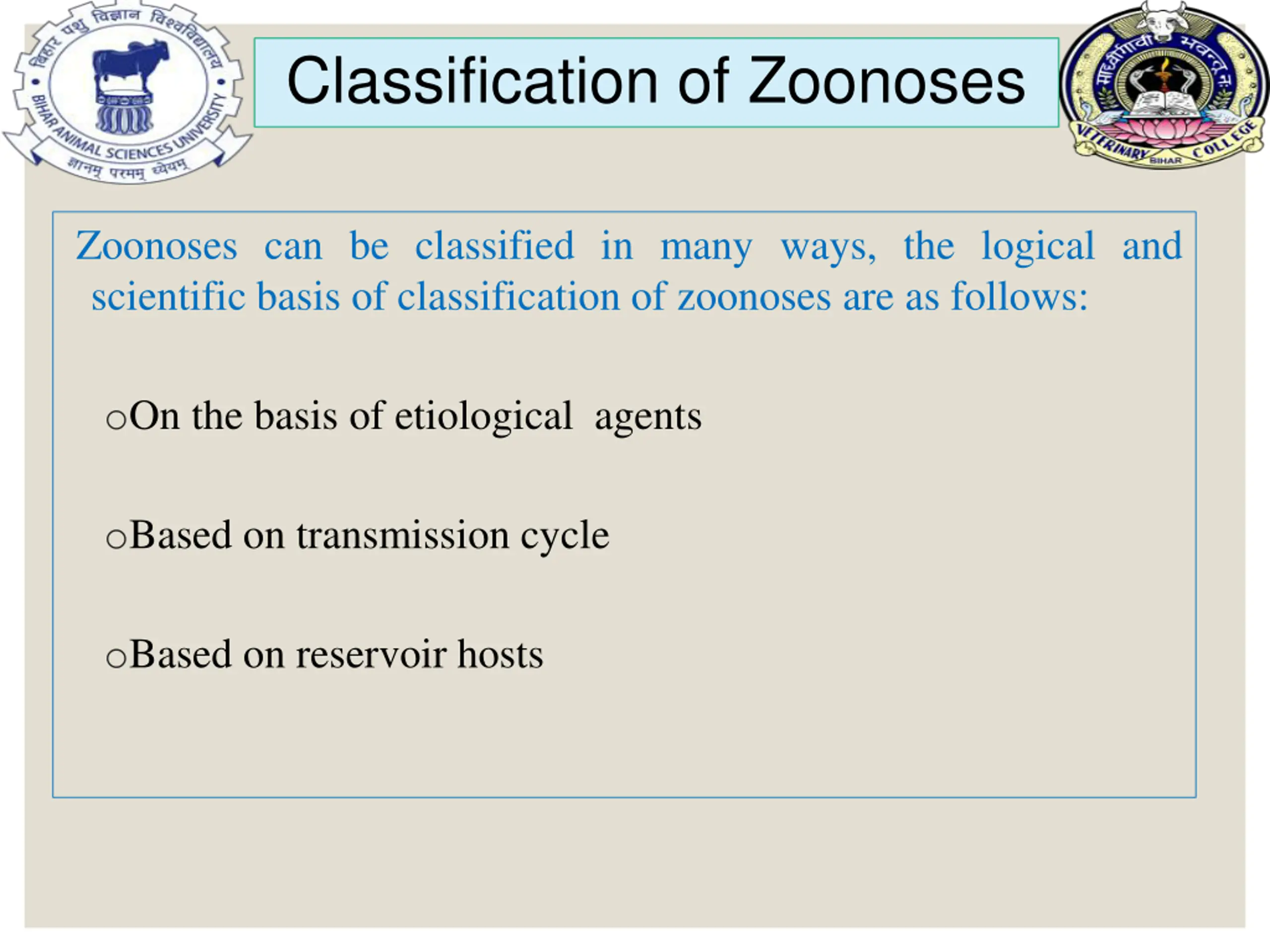 Classification of Zoonoses Zoonoses can be classified in many ways, the logical and scientific basis of classification of zoonoses are as follows: oOn the basis of etiological agents oBased on transmission cycle oBased on reservoir hosts