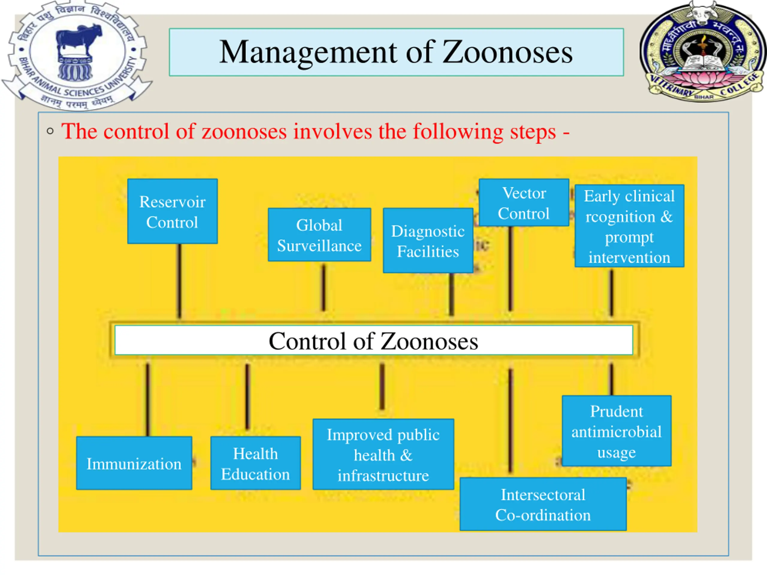 Management of Zoonoses The control of zoonoses involves the following steps - Vector Control Early clinical rcognition & prompt intervention Reservoir Control Global Surveillance Diagnostic Facilities Control of Zoonoses Prudent antimicrobial usage Improved public health & infrastructure Health Education Immunization Intersectoral Co-ordination