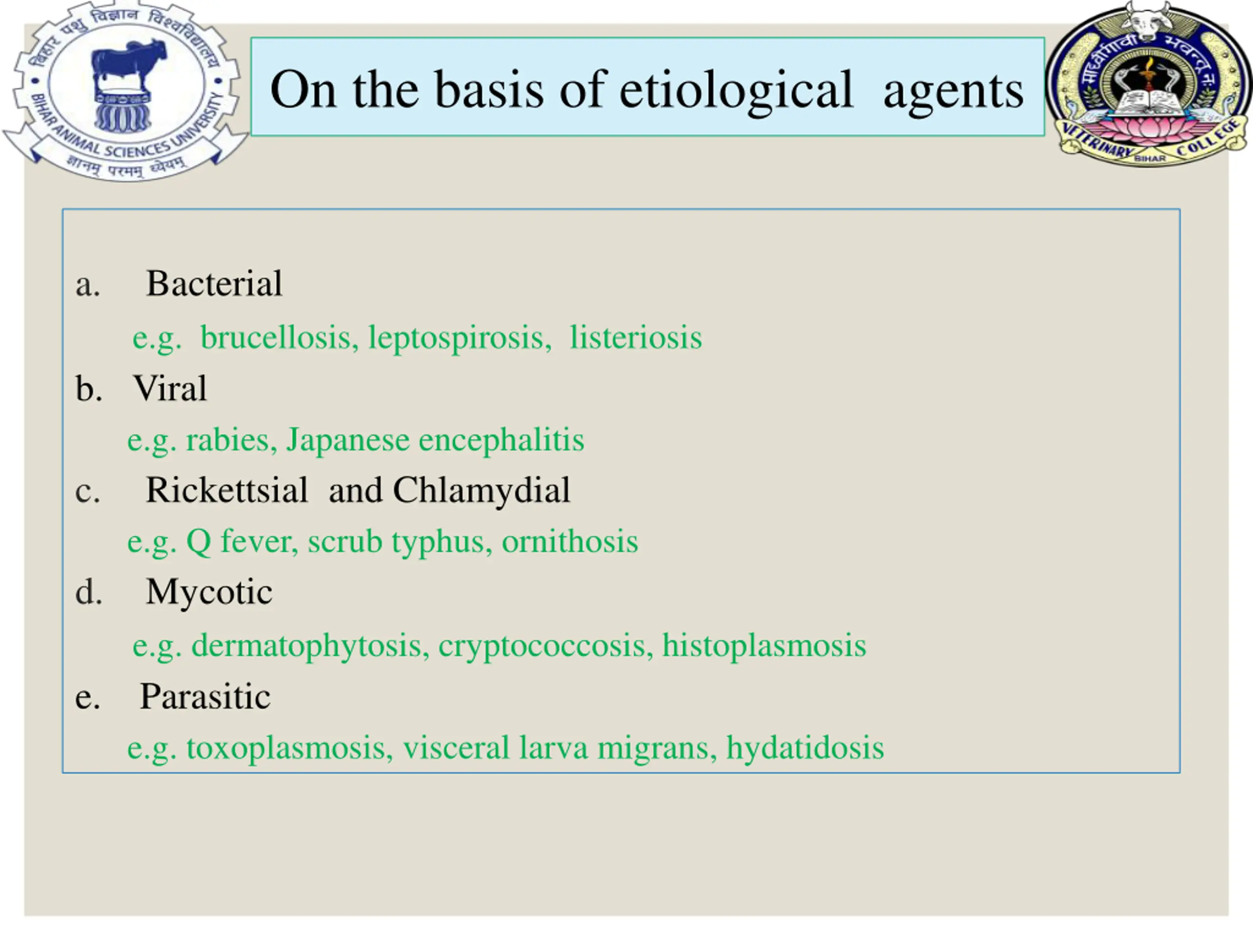 On the basis of etiological agents a. Bacterial e.g. brucellosis, leptospirosis, listeriosis b. Viral e.g. rabies, Japanese encephalitis c. Rickettsial and Chlamydial e.g. Q fever, scrub typhus, ornithosis d. Mycotic e.g. dermatophytosis, cryptococcosis, histoplasmosis e. Parasitic e.g. toxoplasmosis, visceral larva migrans, hydatidosis