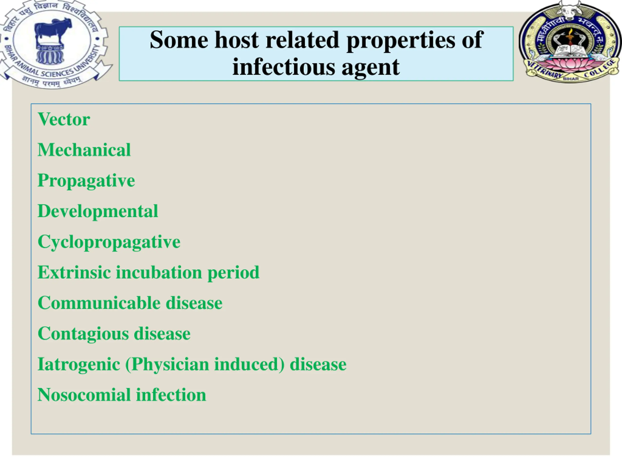 Some host related properties of infectious agent Vector Mechanical Propagative Developmental Cyclopropagative Extrinsic incubation period Communicable disease Contagious disease Iatrogenic (Physician induced) disease Nosocomial infection