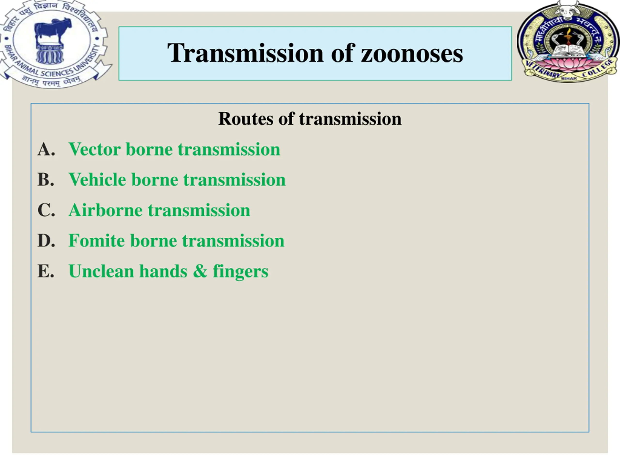 Transmission of zoonoses Routes of transmission A. Vector borne transmission B. Vehicle borne transmission C. Airborne transmission D. Fomite borne transmission E. Unclean hands & fingers