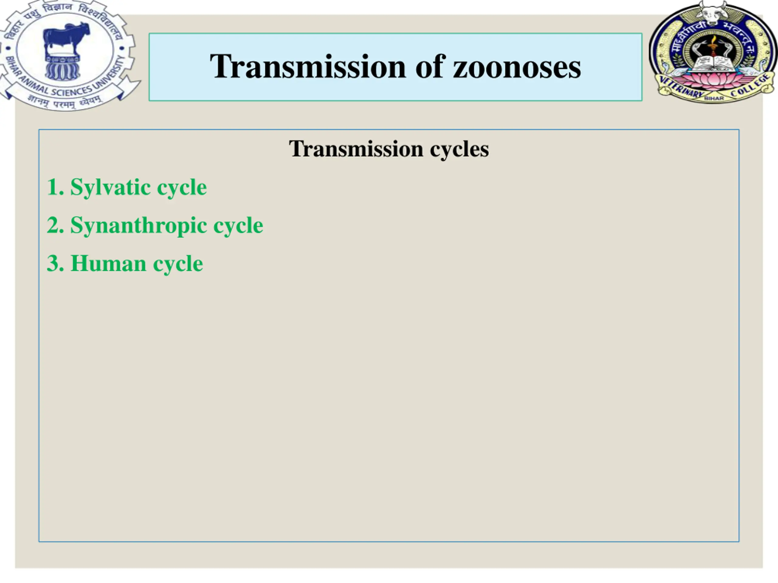 Transmission of zoonoses Transmission cycles 1. Sylvatic cycle 2. Synanthropic cycle 3. Human cycle