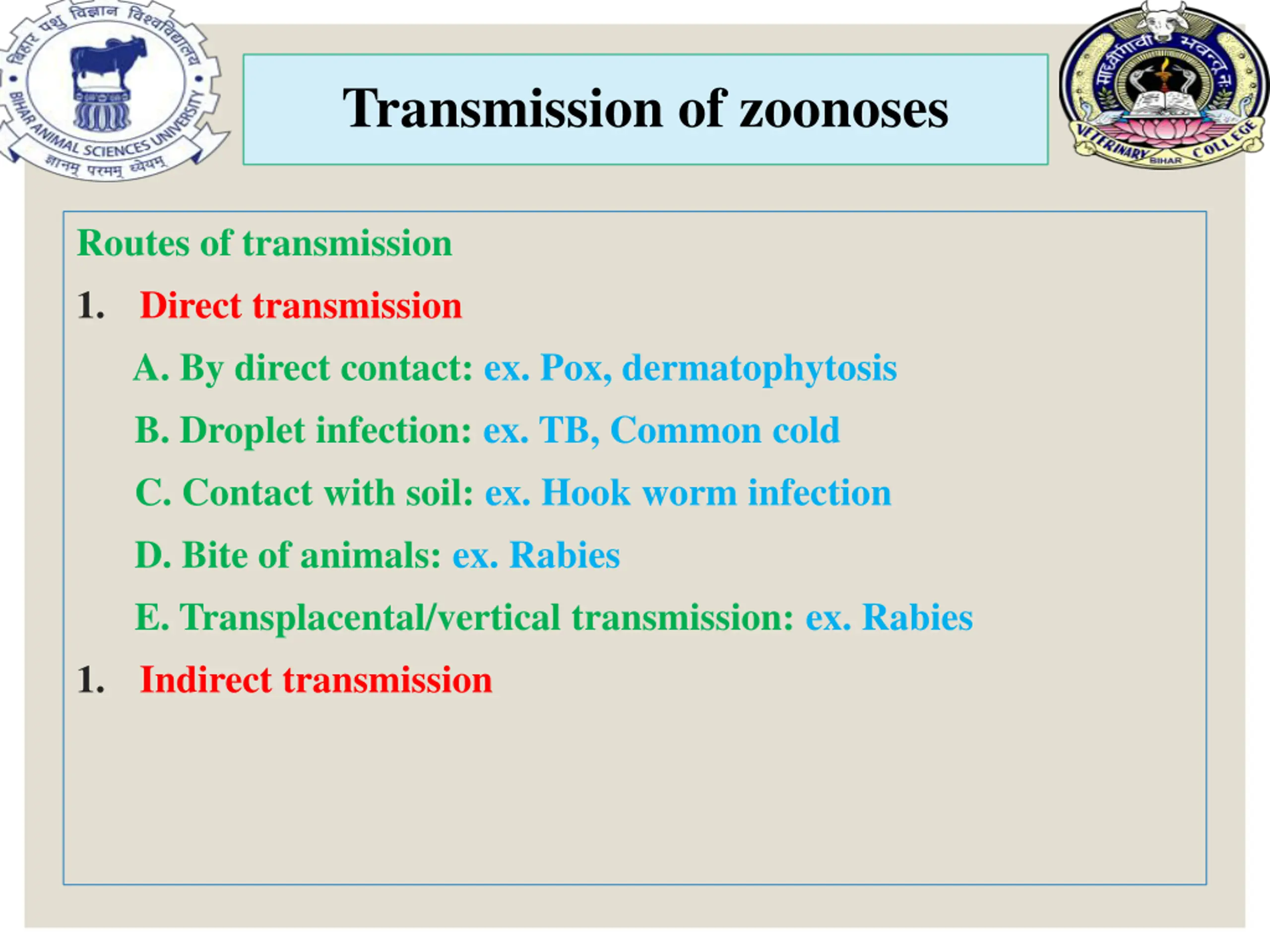 Transmission of zoonoses Routes of transmission 1. Direct transmission A. By direct contact: ex. Pox, dermatophytosis B. Droplet infection: ex. TB, Common cold C. Contact with soil: ex. Hook worm infection D. Bite of animals: ex. Rabies E. Transplacental/vertical transmission: ex. Rabies 1. Indirect transmission