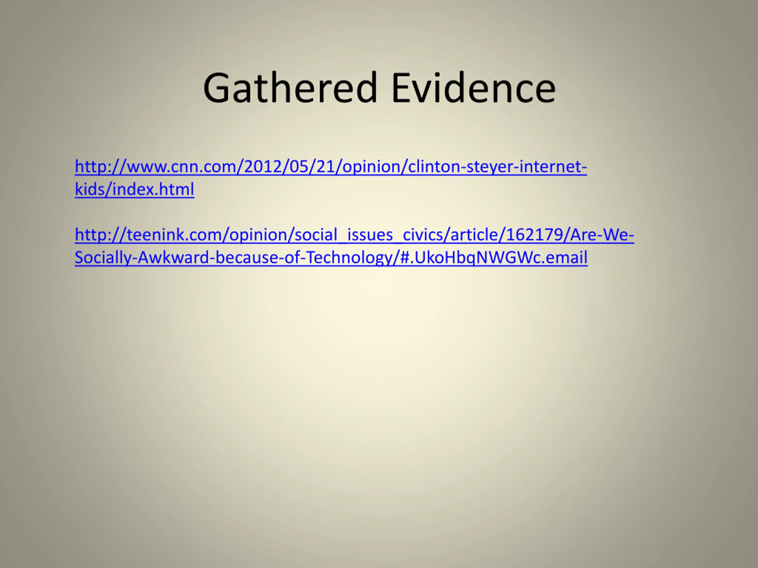 Gathered Evidence http://www.cnn.com/2012/05/21/opinion/clinton-steyer-internet-kids/index.html http://teenink.com/opinion/social_issues_civics/article/162179/Are-We-Socially-Awkward-because-of-Technology/#.UkoHbqNWGWc.email http://www.cnn.com/2012/05/21/opinion/clinton-steyer-internet- kids/index.html http://teenink.com/opinion/social_issues_civics/article/162179/Are-We- Socially-Awkward-because-of-Technology/#.UkoHbqNWGWc.email