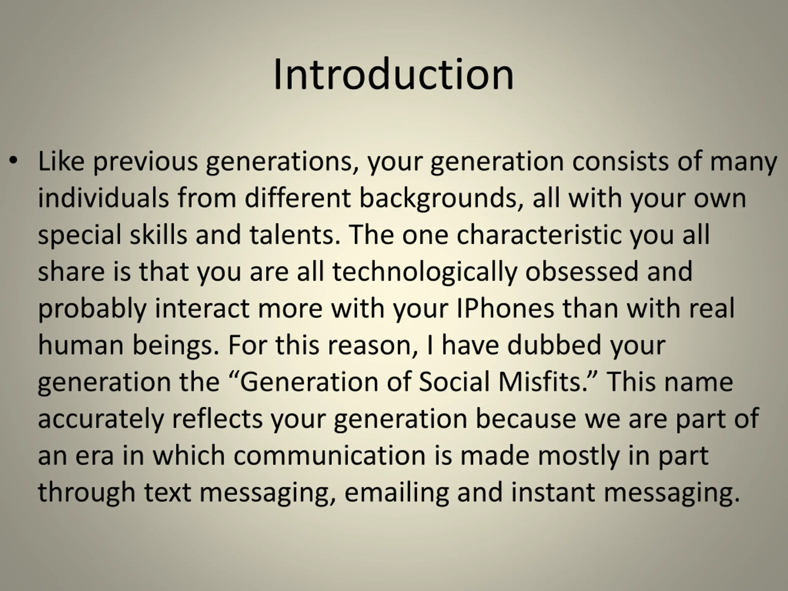 Introduction Like previous generations, your generation consists of many individuals from different backgrounds, all with your own special skills and talents. The one characteristic you all share is that you are all technologically obsessed and probably interact more with your IPhones than with real human beings. For this reason, I have dubbed your generation the Generation of Social Misfits. This name accurately reflects your generation because we are part of an era in which communication is made mostly in part through text messaging, emailing and instant messaging.