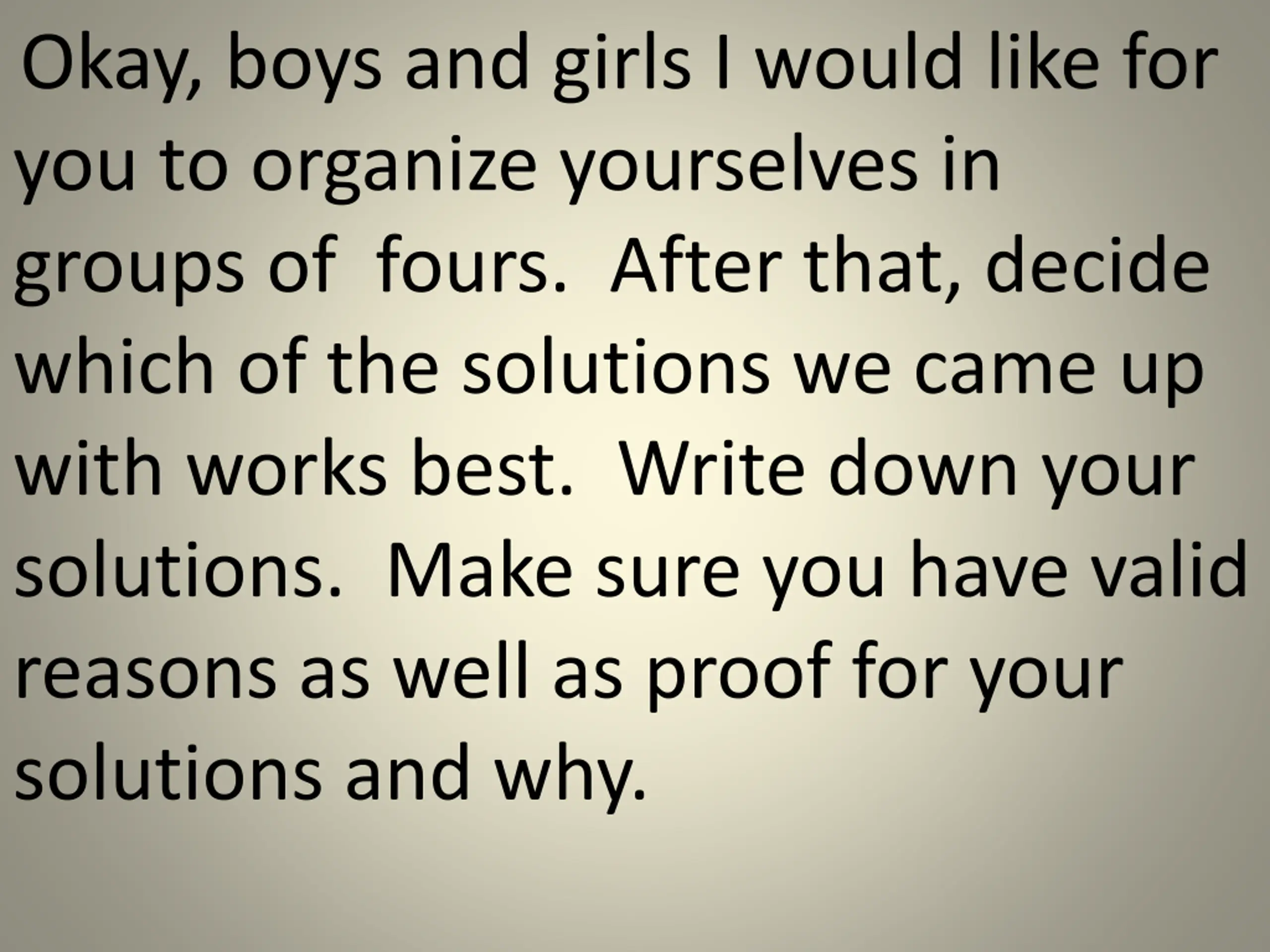 Okay, boys and girls I would like for you to organize yourselves in groups of fours. After that, decide which of the solutions we came up with works best. Write down your solutions. Make sure you have valid reasons as well as proof for your solutions and why.