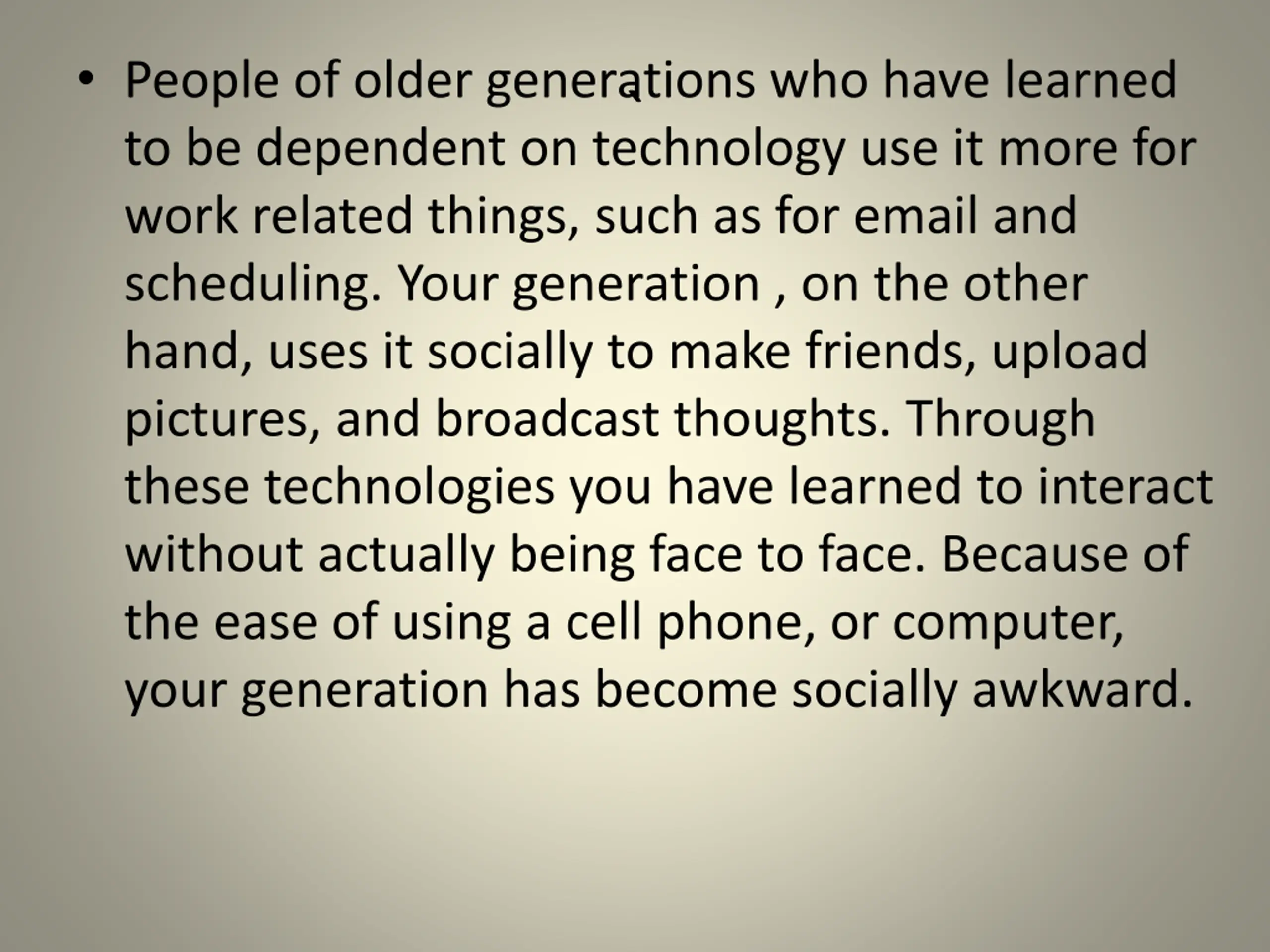 People of older generations who have learned to be dependent on technology use it more for work related things, such as for email and scheduling. Your generation , on the other hand, uses it socially to make friends, upload pictures, and broadcast thoughts. Through these technologies you have learned to interact without actually being face to face. Because of the ease of using a cell phone, or computer, your generation has become socially awkward. `