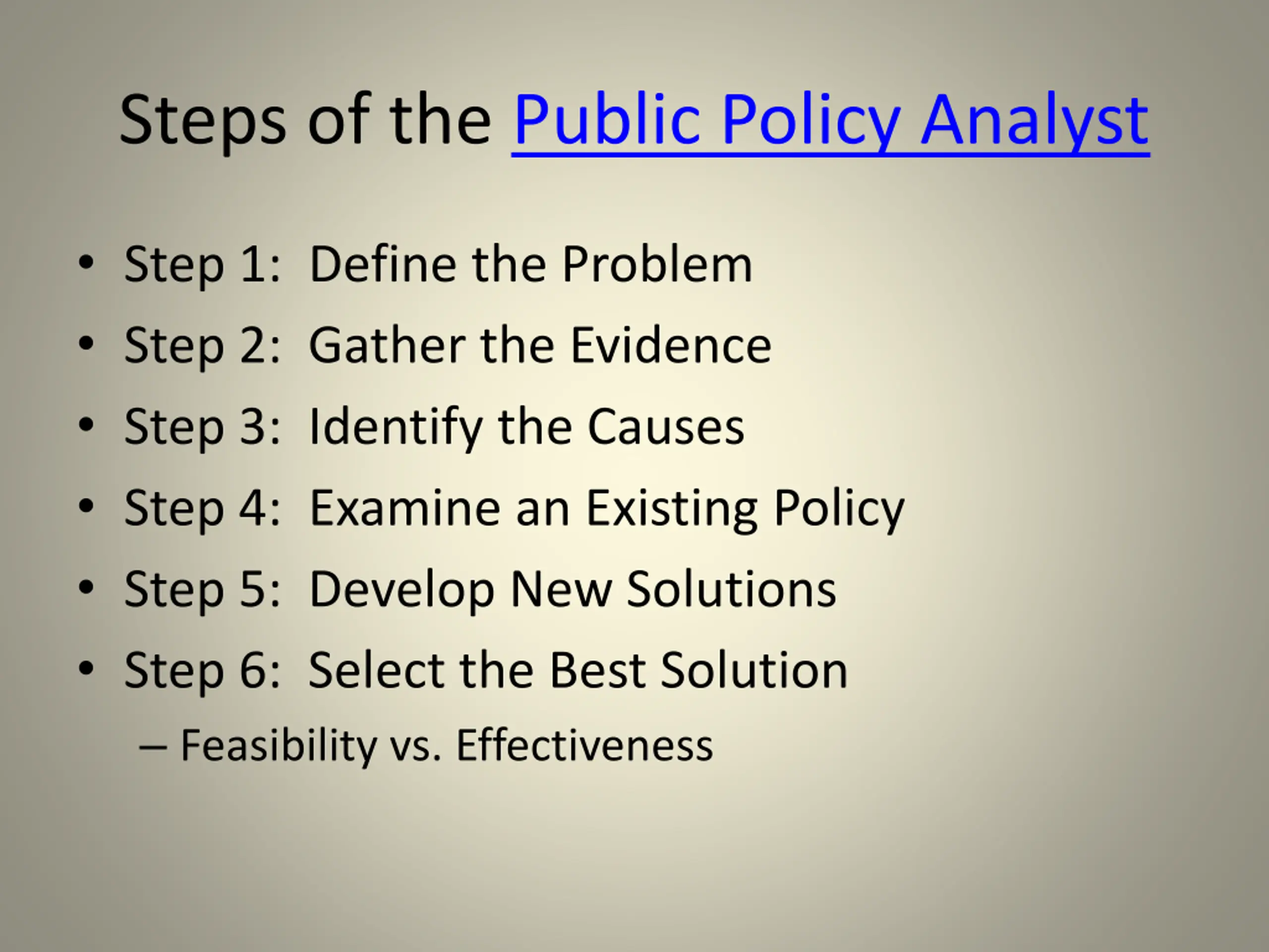 Steps of the Public Policy Analyst Step 1: Define the Problem Step 2: Gather the Evidence Step 3: Identify the Causes Step 4: Examine an Existing Policy Step 5: Develop New Solutions Step 6: Select the Best Solution Feasibility vs. Effectiveness