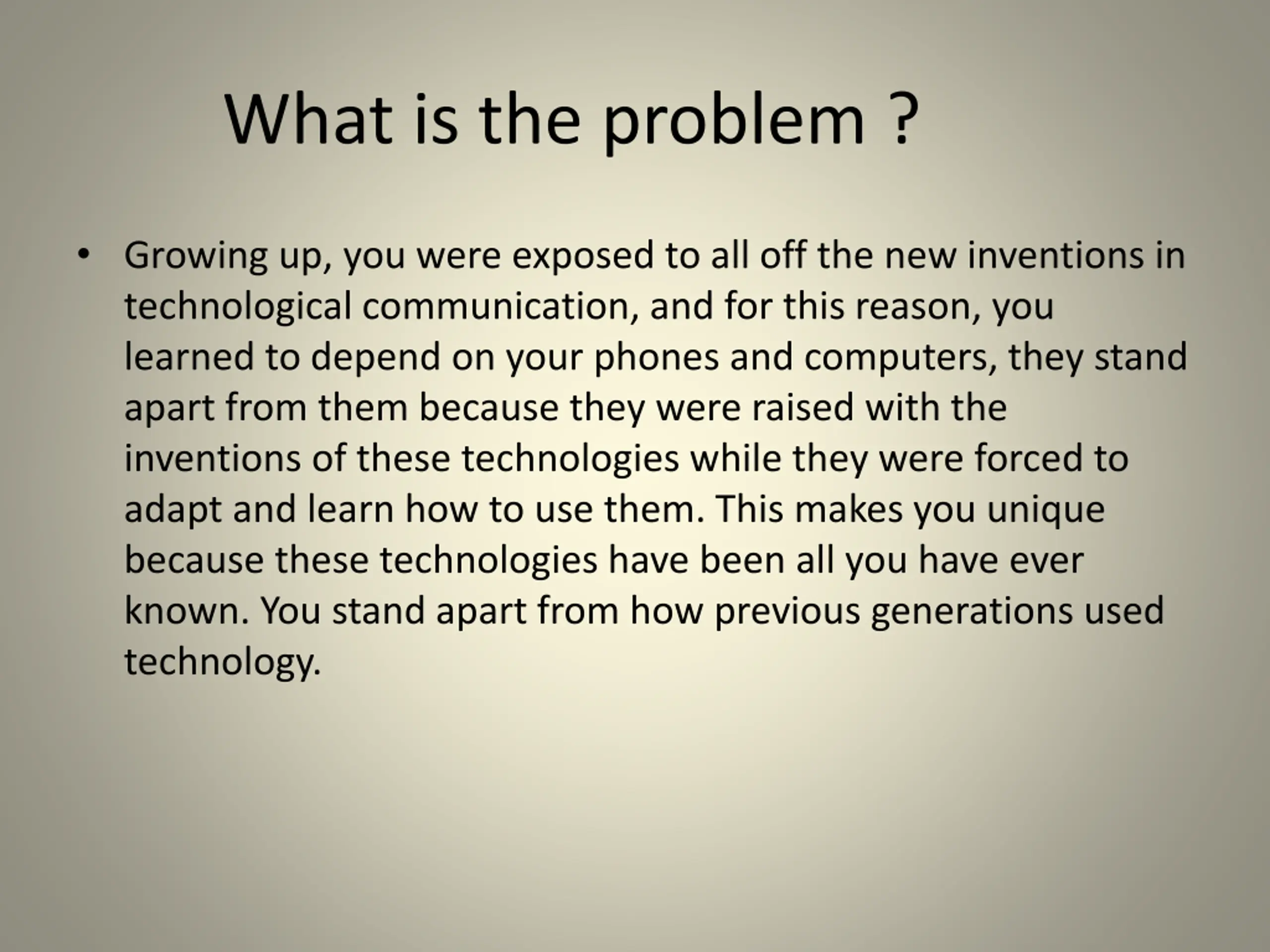 What is the problem ? Growing up, you were exposed to all off the new inventions in technological communication, and for this reason, you learned to depend on your phones and computers, they stand apart from them because they were raised with the inventions of these technologies while they were forced to adapt and learn how to use them. This makes you unique because these technologies have been all you have ever known. You stand apart from how previous generations used technology.