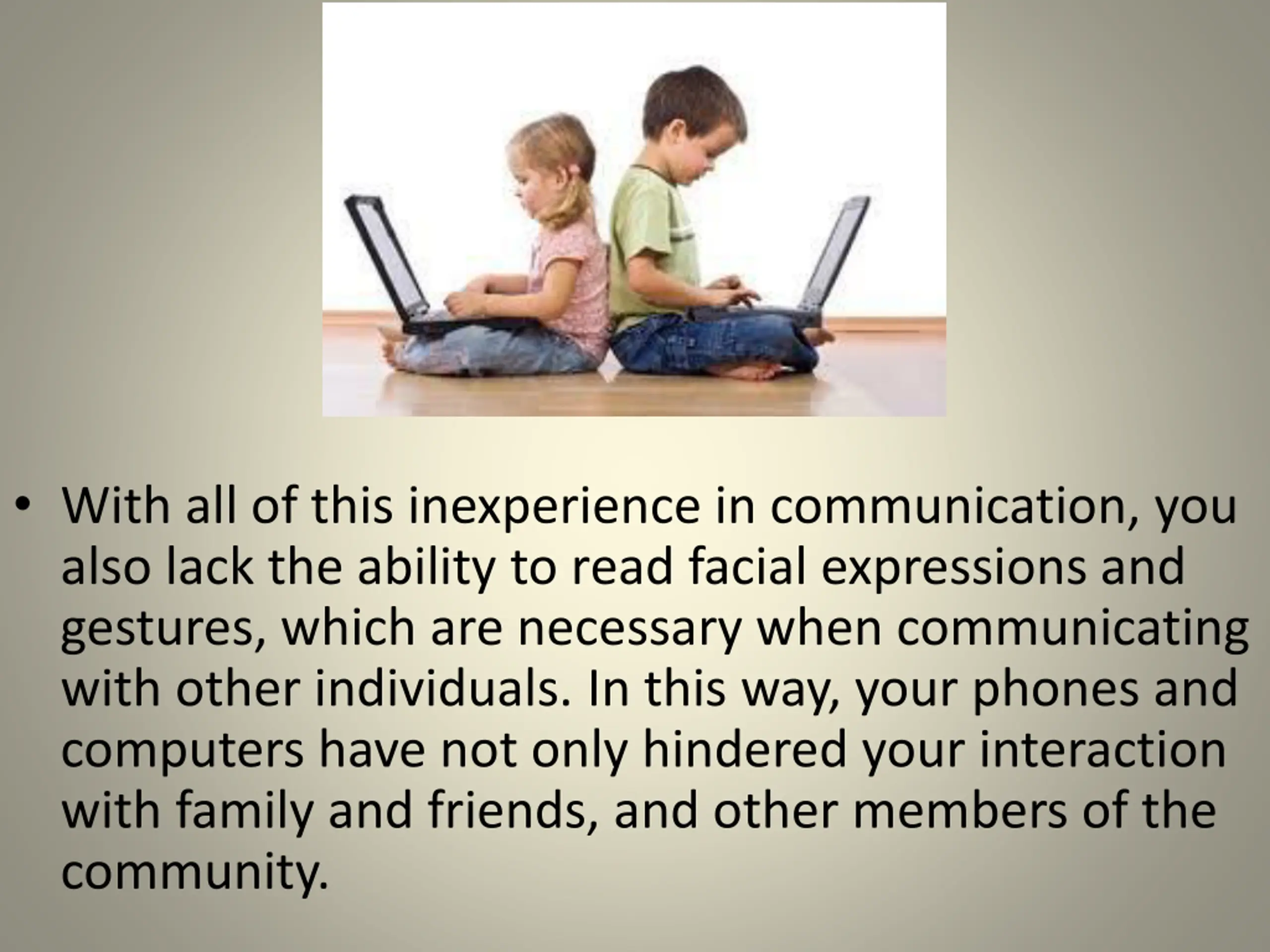 With all of this inexperience in communication, you also lack the ability to read facial expressions and gestures, which are necessary when communicating with other individuals. In this way, your phones and computers have not only hindered your interaction with family and friends, and other members of the community.