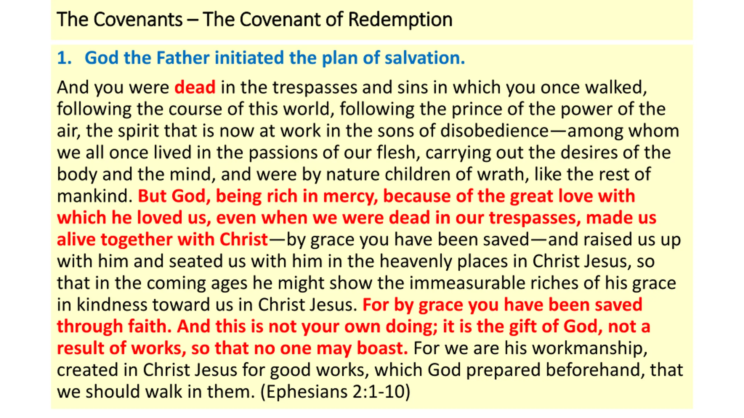 The Covenants The Covenants The Covenant of Redemption The Covenant of Redemption 1. God the Father initiated the plan of salvation. And you were dead in the trespasses and sins in which you once walked, following the course of this world, following the prince of the power of the air, the spirit that is now at work in the sons of disobedience among whom we all once lived in the passions of our flesh, carrying out the desires of the body and the mind, and were by nature children of wrath, like the rest of mankind. But God, being rich in mercy, because of the great love with which he loved us, even when we were dead in our trespasses, made us alive together with Christ by grace you have been saved and raised us up with him and seated us with him in the heavenly places in Christ Jesus, so that in the coming ages he might show the immeasurable riches of his grace in kindness toward us in Christ Jesus. For by grace you have been saved through faith. And this is not your own doing; it is the gift of God, not a result of works, so that no one may boast. For we are his workmanship, created in Christ Jesus for good works, which God prepared beforehand, that we should walk in them. (Ephesians 2:1-10)