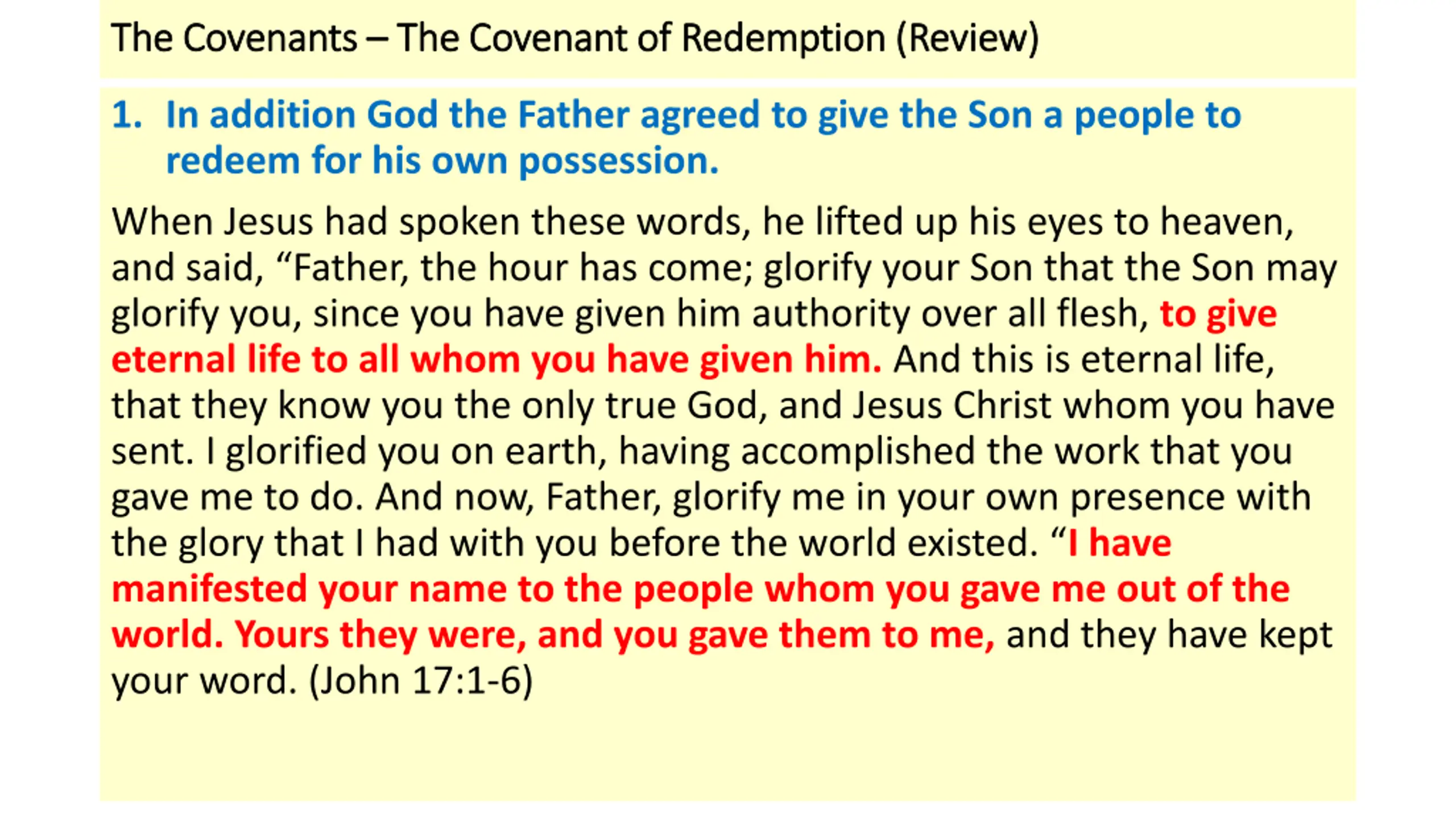 The Covenants The Covenants The Covenant of Redemption (Review) The Covenant of Redemption (Review) 1. In addition God the Father agreed to give the Son a people to redeem for his own possession. When Jesus had spoken these words, he lifted up his eyes to heaven, and said, Father, the hour has come; glorify your Son that the Son may glorify you, since you have given him authority over all flesh, to give eternal life to all whom you have given him. And this is eternal life, that they know you the only true God, and Jesus Christ whom you have sent. I glorified you on earth, having accomplished the work that you gave me to do. And now, Father, glorify me in your own presence with the glory that I had with you before the world existed. I have manifested your name to the people whom you gave me out of the world. Yours they were, and you gave them to me, and they have kept your word. (John 17:1-6)