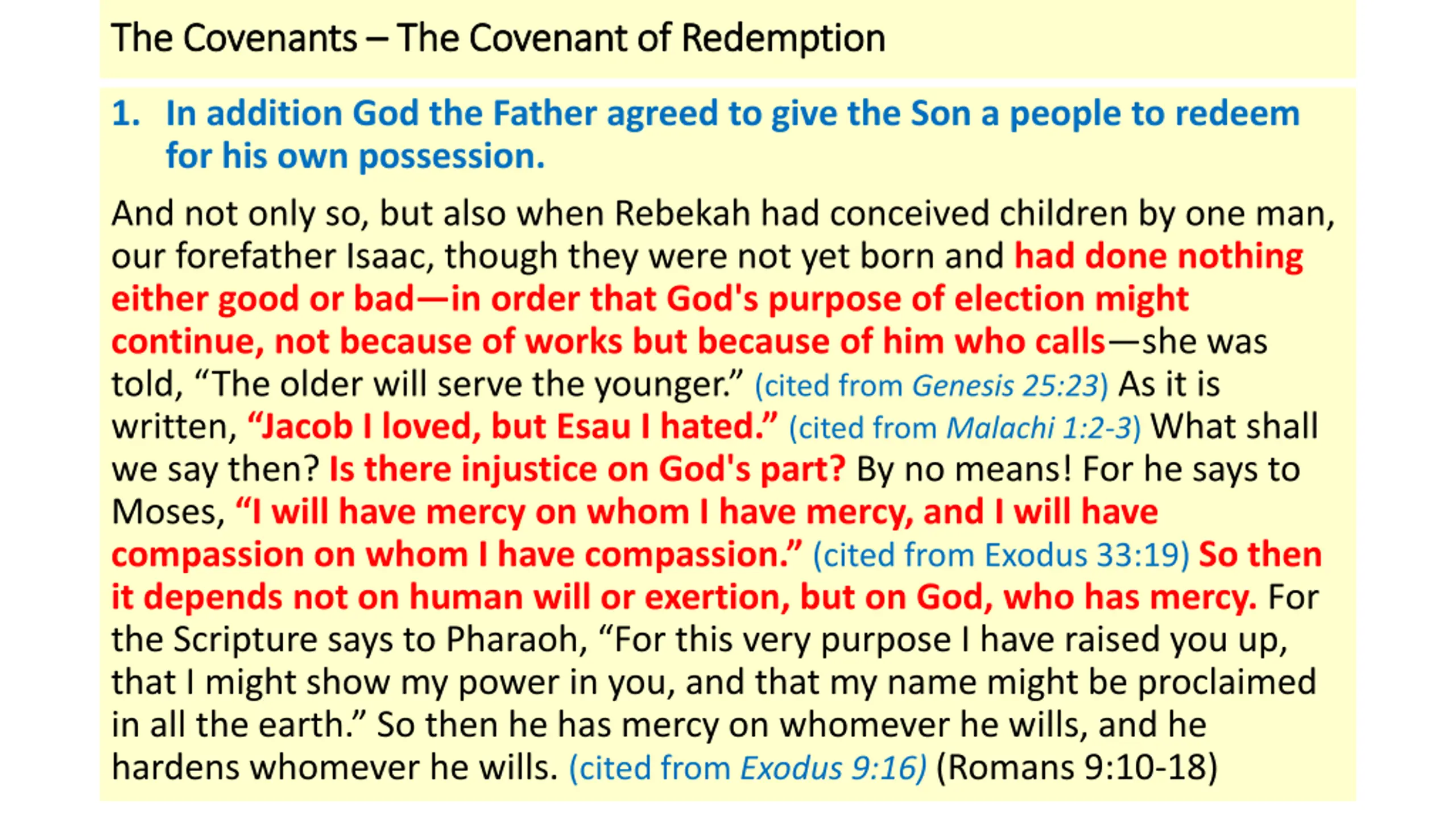 The Covenants The Covenants The Covenant of Redemption The Covenant of Redemption 1. In addition God the Father agreed to give the Son a people to redeem for his own possession. And not only so, but also when Rebekah had conceived children by one man, our forefather Isaac, though they were not yet born and had done nothing either good or bad in order that God's purpose of election might continue, not because of works but because of him who calls she was told, The older will serve the younger. (cited from Genesis 25:23) As it is written, Jacob I loved, but Esau I hated. (cited from Malachi 1:2-3)What shall we say then? Is there injustice on God's part? By no means! For he says to Moses, I will have mercy on whom I have mercy, and I will have compassion on whom I have compassion. (cited from Exodus 33:19) So then it depends not on human will or exertion, but on God, who has mercy. For the Scripture says to Pharaoh, For this very purpose I have raised you up, that I might show my power in you, and that my name might be proclaimed in all the earth. So then he has mercy on whomever he wills, and he hardens whomever he wills. (cited from Exodus 9:16) (Romans 9:10-18)