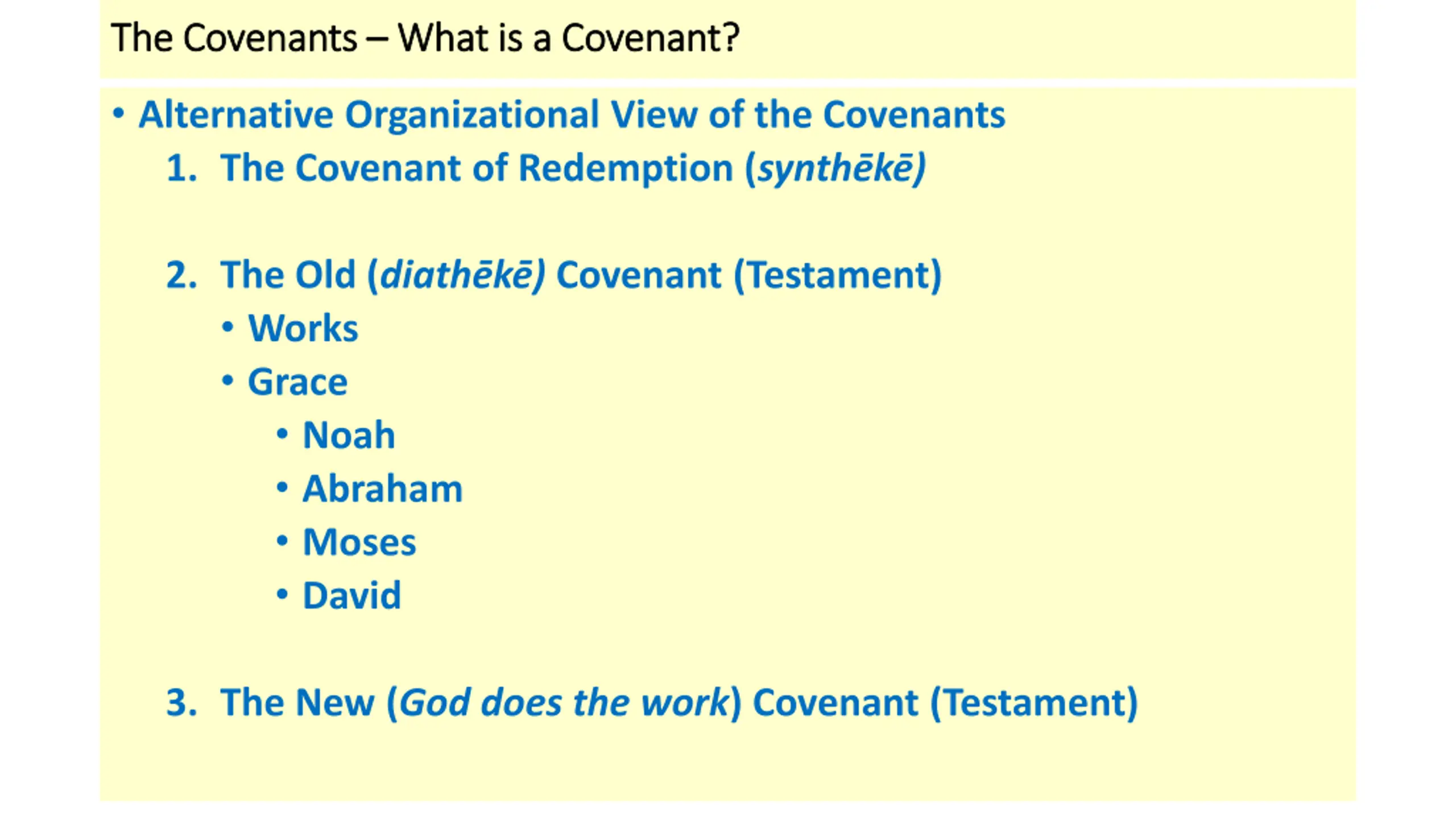 The Covenants The Covenants What is a Covenant? What is a Covenant? Alternative Organizational View of the Covenants 1. The Covenant of Redemption (synth k ) 2. The Old (diath k ) Covenant (Testament) Works Grace Noah Abraham Moses David 3. The New (God does the work) Covenant (Testament)