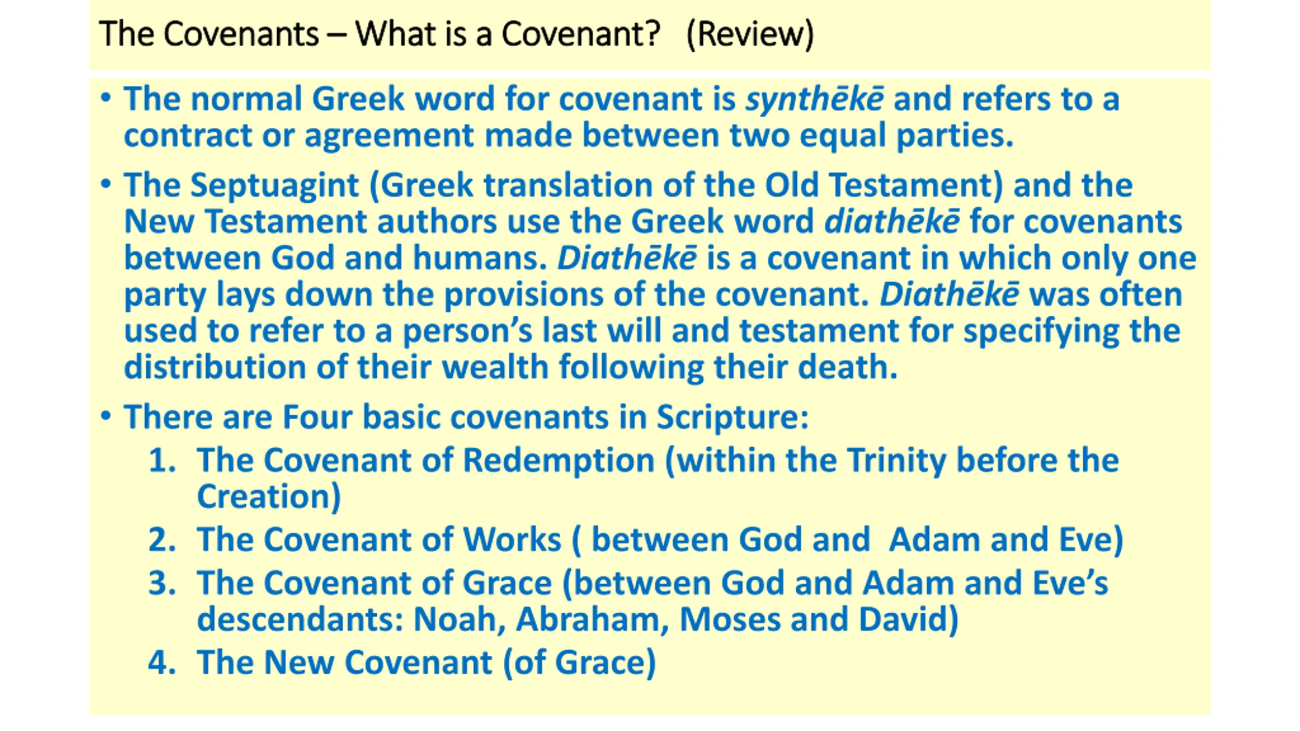The Covenants The Covenants What is a Covenant? (Review) What is a Covenant? (Review) The normal Greek word for covenant is synth k and refers to a contract or agreement made between two equal parties. The Septuagint (Greek translation of the Old Testament) and the New Testament authors use the Greek word diath k for covenants between God and humans. Diath k is a covenant in which only one party lays down the provisions of the covenant. Diath k was often used to refer to a person s last will and testament for specifying the distribution of their wealth following their death. There are Four basic covenants in Scripture: 1. The Covenant of Redemption (within the Trinity before the Creation) 2. The Covenant of Works ( between God and Adam and Eve) 3. The Covenant of Grace (between God and Adam and Eve s descendants: Noah, Abraham, Moses and David) 4. The New Covenant (of Grace)