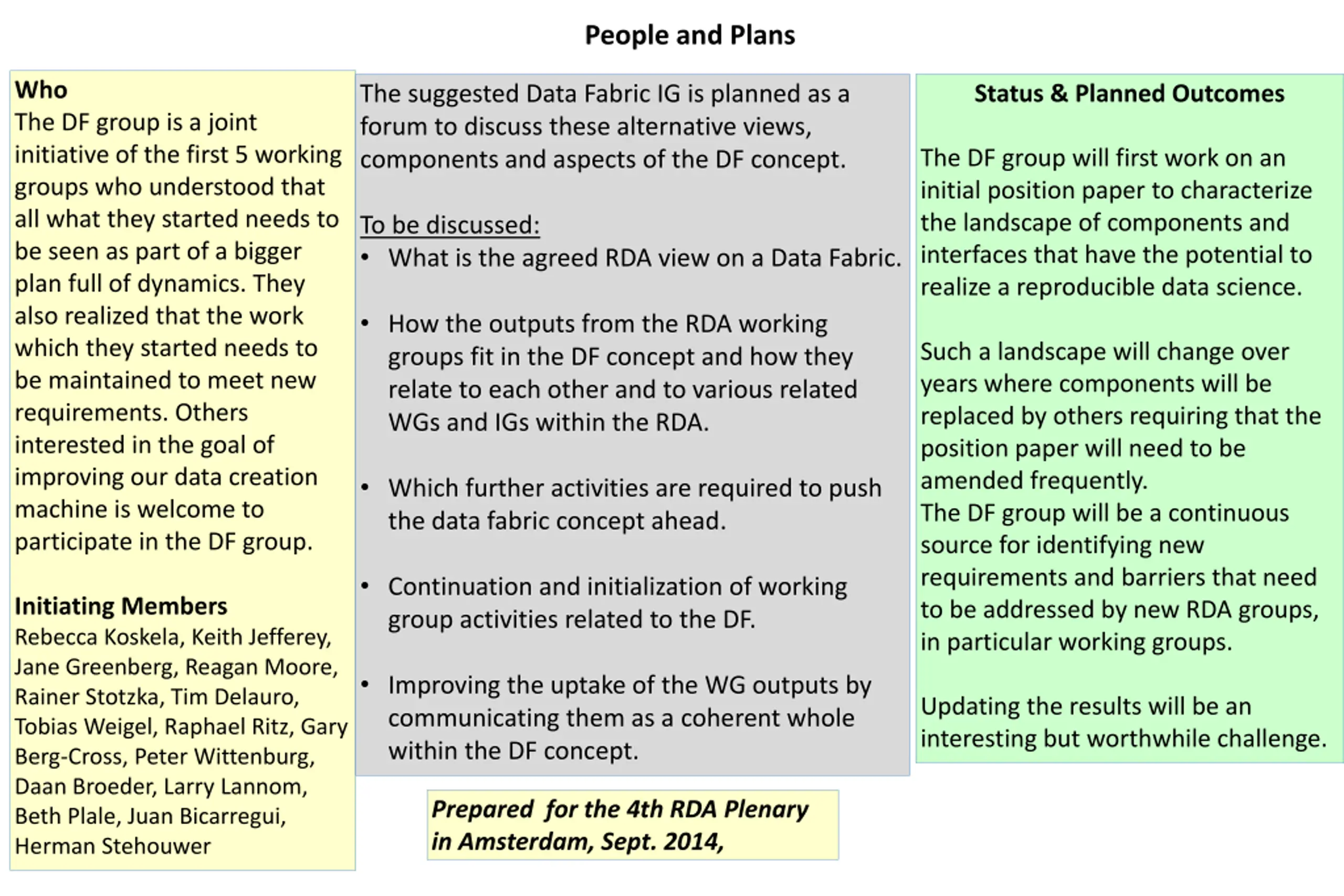 People and Plans Who The DF group is a joint initiative of the first 5 working groups who understood that all what they started needs to be seen as part of a bigger plan full of dynamics. They also realized that the work which they started needs to be maintained to meet new requirements. Others interested in the goal of improving our data creation machine is welcome to participate in the DF group. Status & Planned Outcomes The suggested Data Fabric IG is planned as a forum to discuss these alternative views, components and aspects of the DF concept. The DF group will first work on an initial position paper to characterize the landscape of components and interfaces that have the potential to realize a reproducible data science. To be discussed: What is the agreed RDA view on a Data Fabric. How the outputs from the RDA working groups fit in the DF concept and how they relate to each other and to various related WGs and IGs within the RDA. Such a landscape will change over years where components will be replaced by others requiring that the position paper will need to be amended frequently. The DF group will be a continuous source for identifying new requirements and barriers that need to be addressed by new RDA groups, in particular working groups. Which further activities are required to push the data fabric concept ahead. Continuation and initialization of working group activities related to the DF. Initiating Members Rebecca Koskela, Keith Jefferey, Jane Greenberg, Reagan Moore, Rainer Stotzka, Tim Delauro, Tobias Weigel, Raphael Ritz, Gary Berg-Cross, Peter Wittenburg, Daan Broeder, Larry Lannom, Beth Plale, Juan Bicarregui, Herman Stehouwer Improving the uptake of the WG outputs by communicating them as a coherent whole within the DF concept. Updating the results will be an interesting but worthwhile challenge. Prepared for the 4th RDA Plenary in Amsterdam, Sept. 2014,